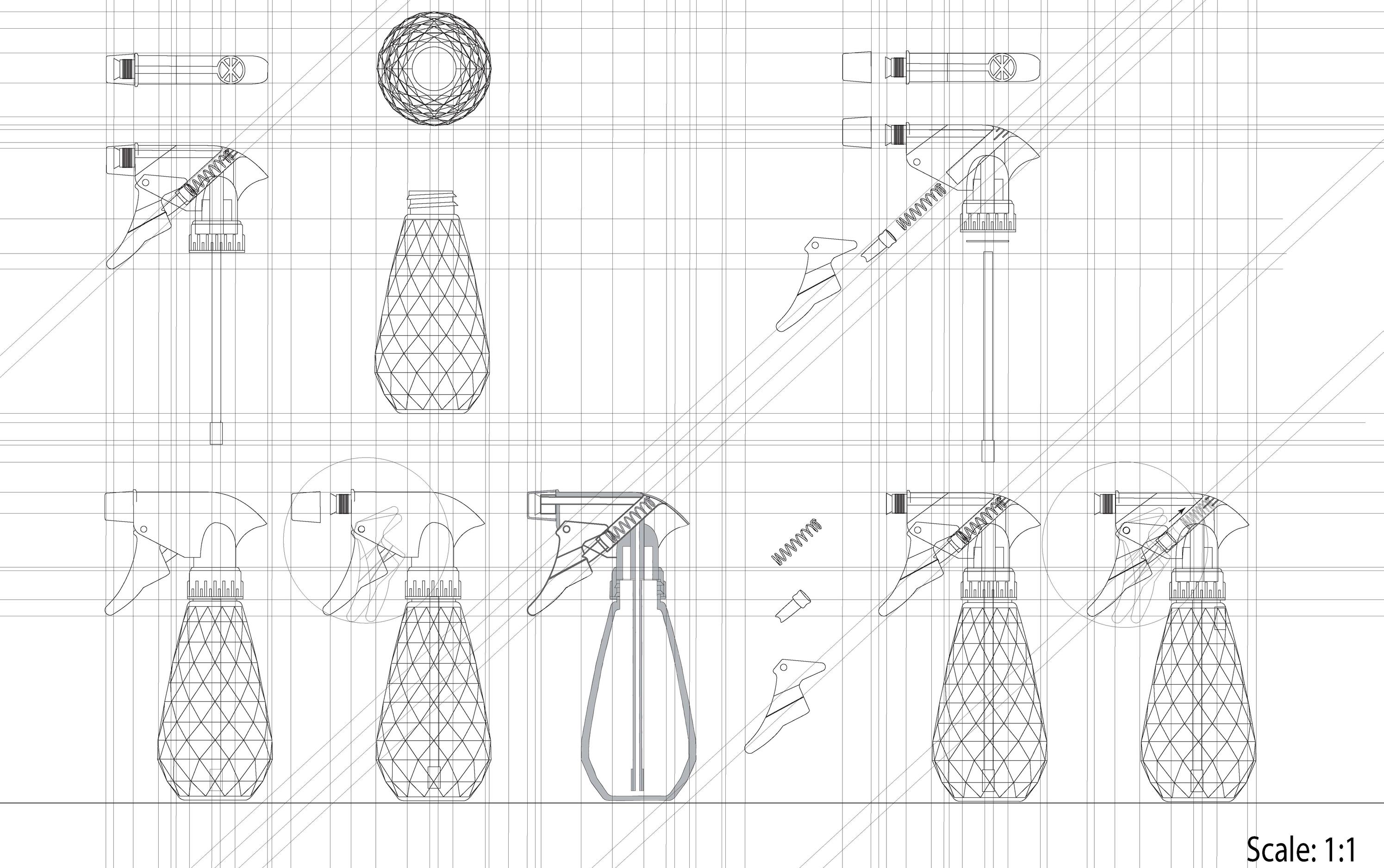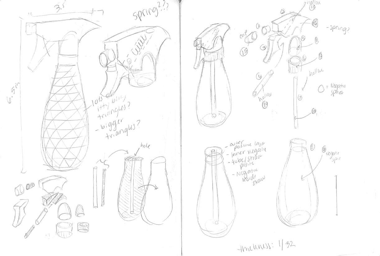 I took a spray bottle apart and analyzed its solid, void, and mechanical aspects. This project taught me how spatial relationships and movement can be recognized on a small scale and applied to larger ones.
