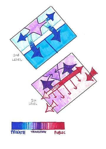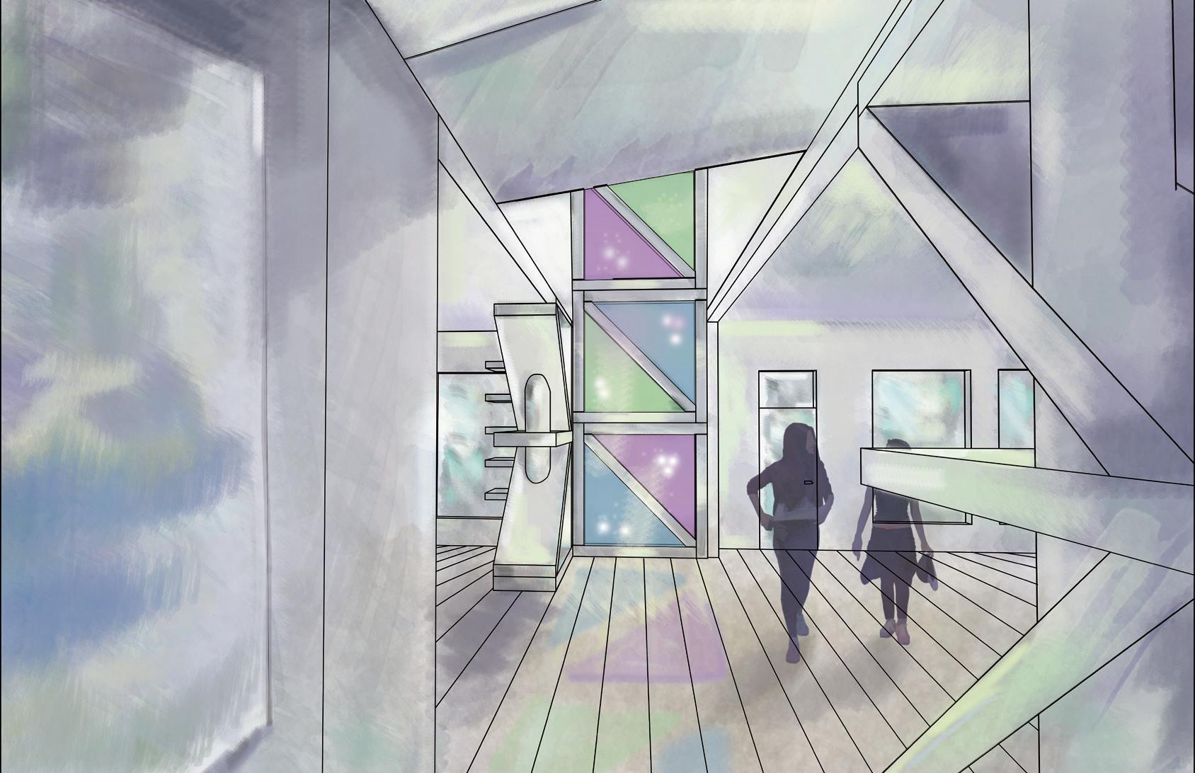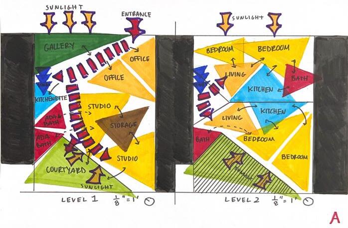 Inspired by the triangular forms and the efficient use of space of my tectonic precedent, I designed an artist residency that could maximize and organize the public and private space accordingly through the dynamism of triangles. Triangular geometry is the guiding factor of the flow of the space, structural components, useful storage techniques, and solar path.