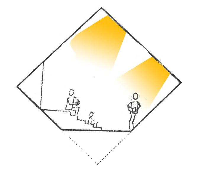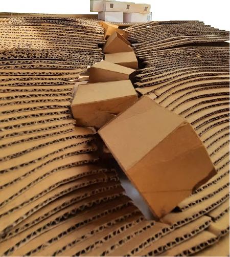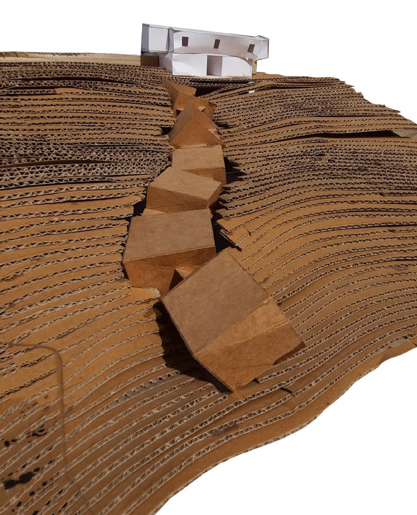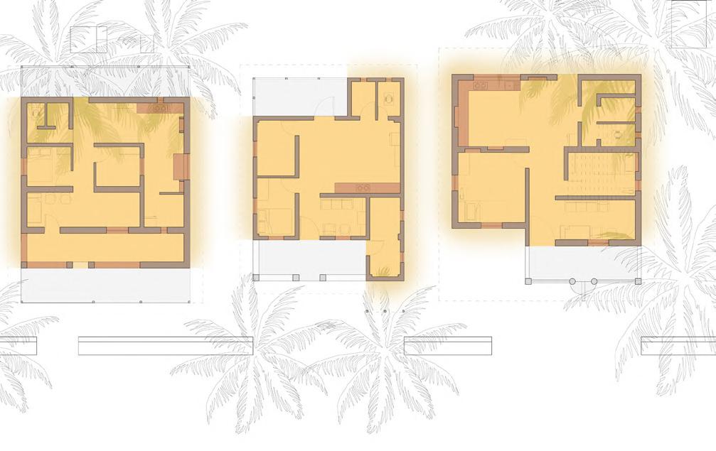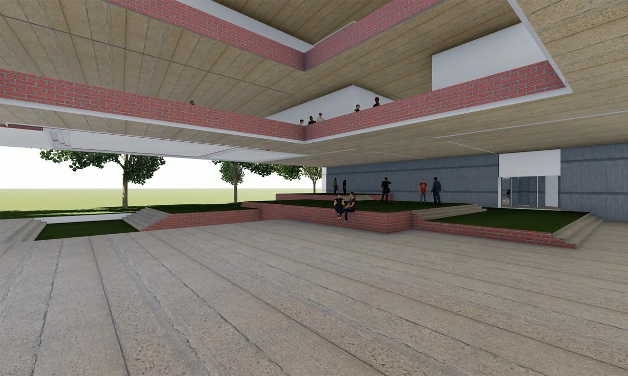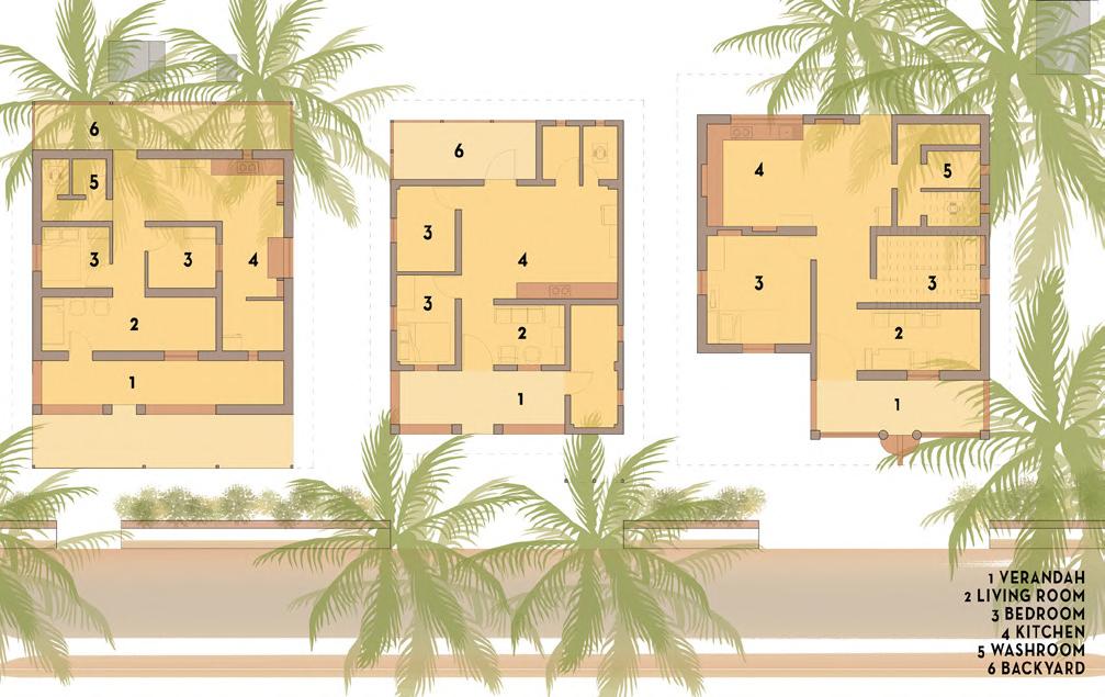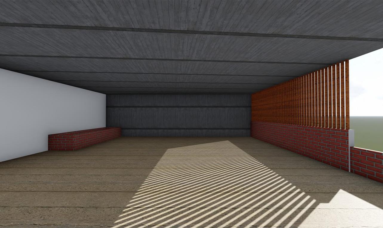 WALL SECTION 6) 30 x 30mm steel frame for fenestration system 7 15mm thick plywood panels for fenestration (600 x 600mm) 10) 50mm thick PCC layering & 25mm thick screed FENESTRATION WALL SECTION CONCRETE COCONUT COIR FABRIC OXIDE FLOORING FOLDABLE DOOR WALL SECTION 1) 25mm banana sheath roofing tiles 2) 50 x 50mm steel purlins 3) 50 x 100mm steel rafters 4) 50 x 50mm supporting steel sections 5) 200 x 200mm steel beam 6) 50 x 50mm steel C section bearing moving wheel for foldable doors 7) 450mm thick rammed earth wall 7) 30mm thick wooden fram e for foldable shutters 8) Coconut coir fabric used for foldable door panels 9) 100 x 100mm steel column to support roof 10) 5mm thick MS plate 11) 10mm thick oxide flooring 12) 50mm thick PCC layering & 25mm screed 14) Stone plinth 13) 300 x 300mm RCC base for steel column FOLDABLE DOOR WALL SECTION STONE RAMMED EARTH STEEL WOOD CONCRETE COCONUT COIR FABRIC OXIDE FLOORING