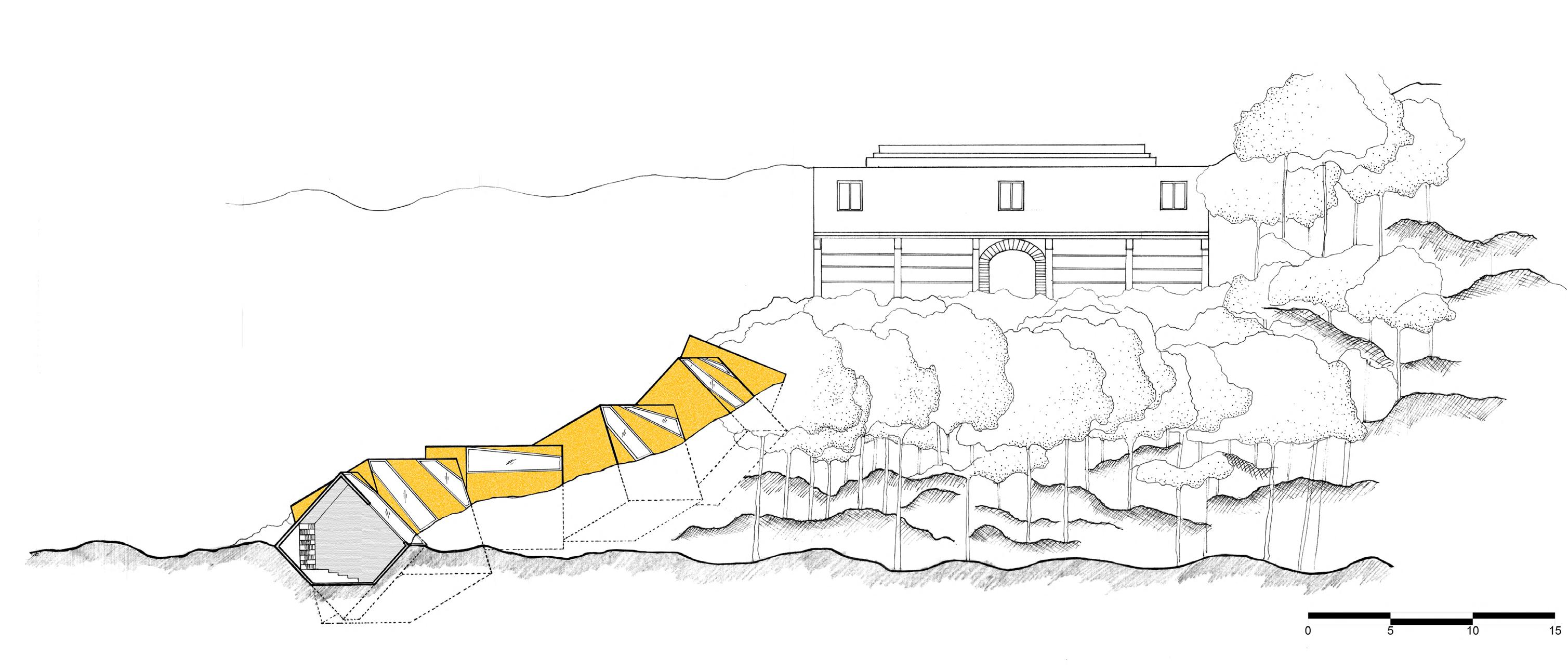 Faces oriented towards North and Northeast to recieve optimum sunlight. The slanted surfaces have windows aligned with the contours of the site.