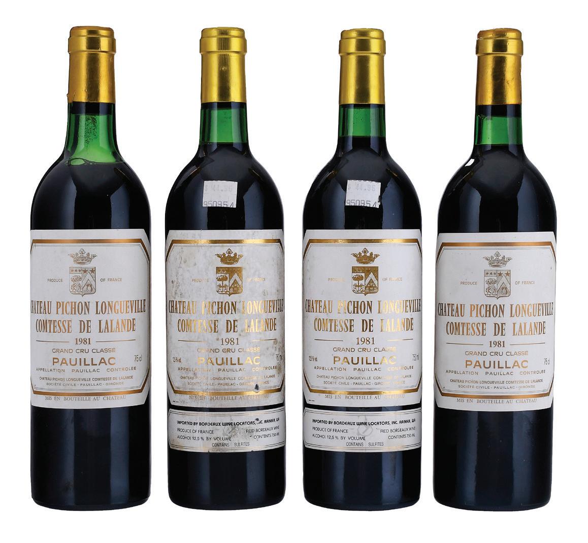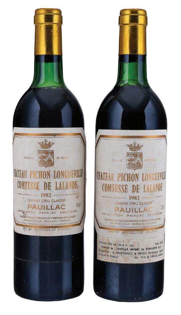 Vintage 1982, Pauillac, France, Red Bordeaux, 750 ml, alcohol 11.5% by volume, ullages to base of neck/very top shoulder, two with ullage to top shoulder, six with depressed but firm corks, capsules with some nicks and corrosion, labels with bin soilage, stains, and wrinkling