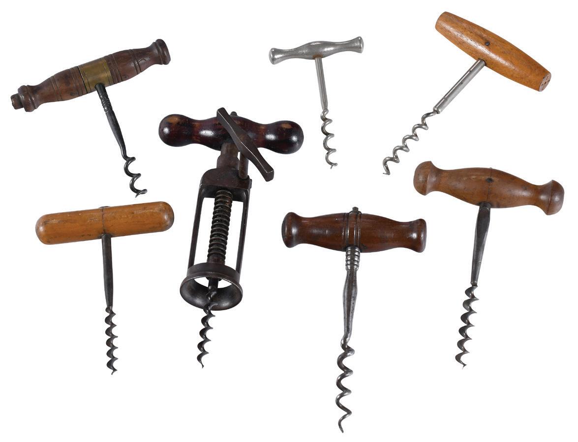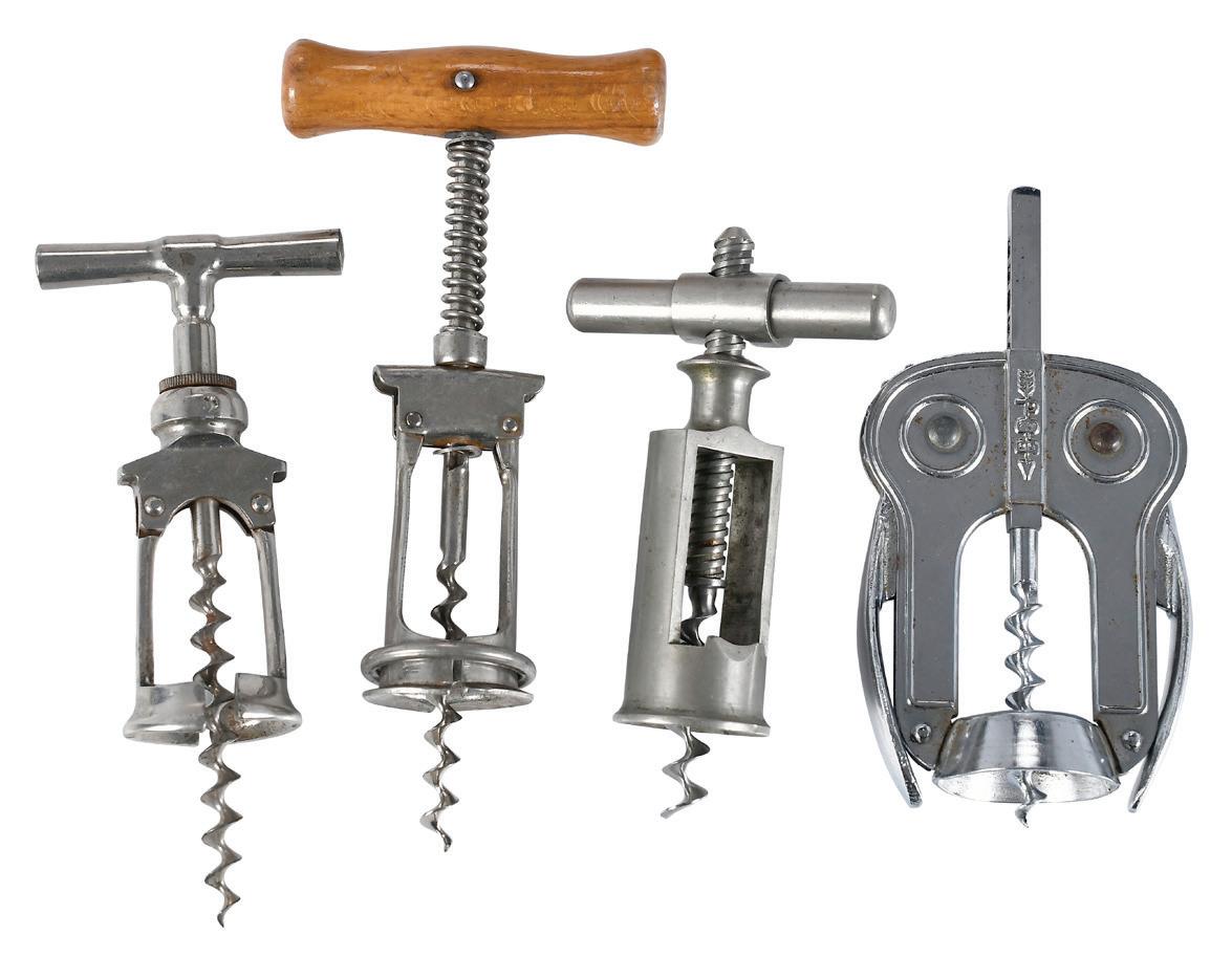 Six Antique Pocket Corkscrews late 19th/early 20th century, comprising: EZ cork puller; two folding iron bow corkscrews; Anheuser Busch bottle corkscrew; small bottle corkscrew; small perfume bottle corkscrew with a bone handle; largest 4-3/4 x 1-5/8 x 1-3/4 in., some slight rust, discoloration, and tarnish
