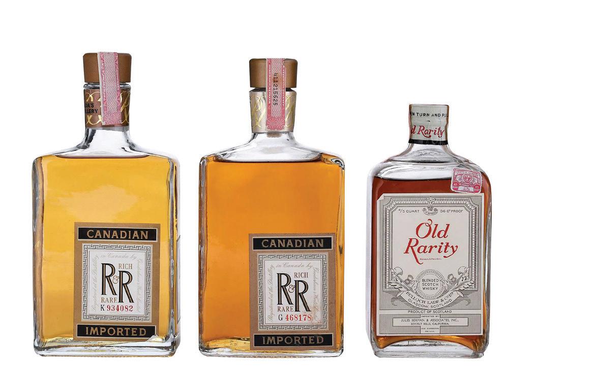 Three Assorted Bottles of Whiskey two bottles Gooderham’s Rich & Rare Canadian Whiskey, 750 ml, alcohol 40% by volume; one bottle Old Rarity Blended Scotch Whiskey, Glasgow, Scotland, 4/5 quart, alcohol 43.4% by volume, in original cardboard box, bottles in overall good condition with some nicks, wear, and small tears to labels