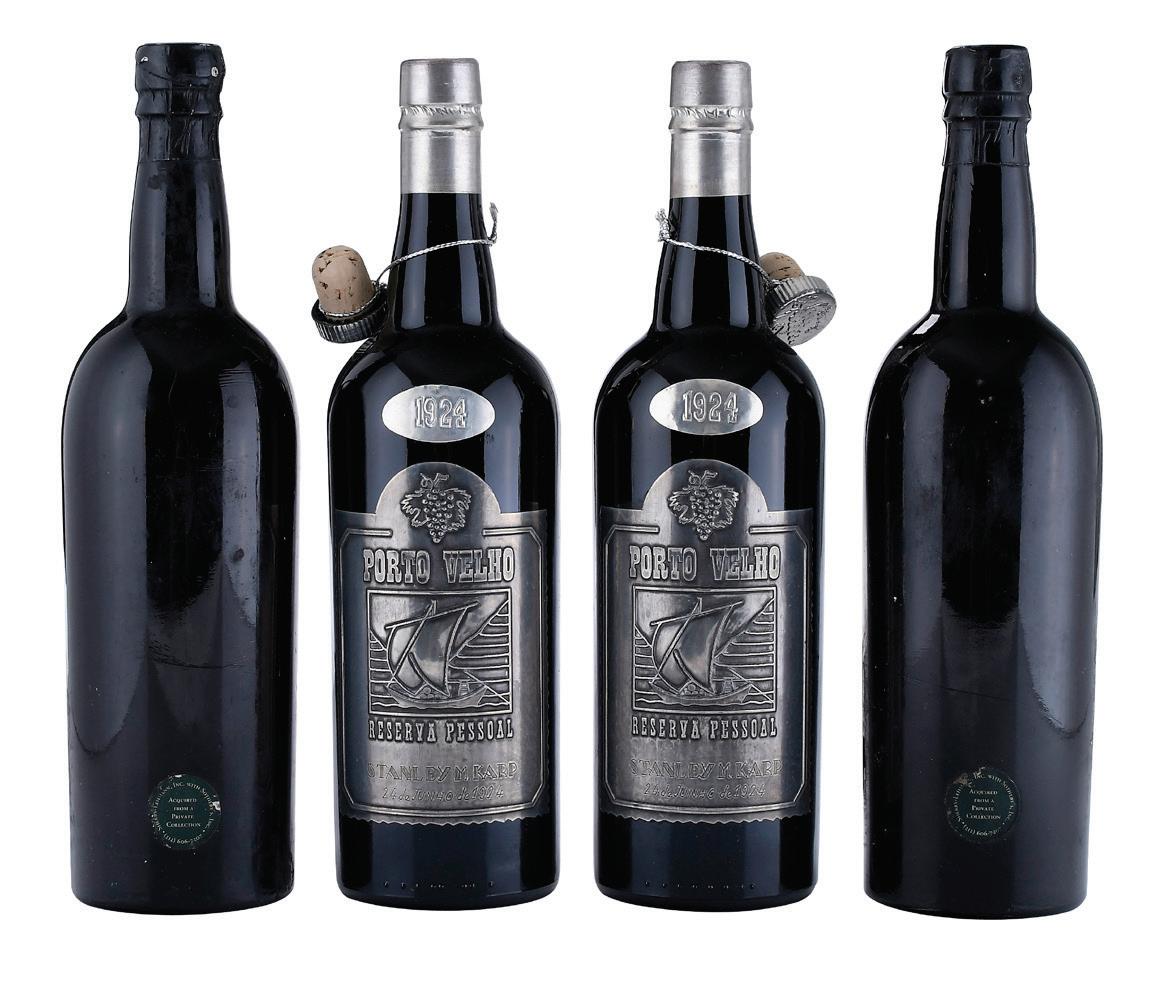 Four Bottles of Assorted Port, Cockburn’s and Stanley M. Karp two bottles Cockburn’s, likely Vintage 1955, Portugal, 750 ml; two bottles Stanley M. Karp Porto Velho, Vintage 1924, Portugal, 740 ml, both Cockburn’s examples lacking labels and with nicks to capsules; Stanley M. Karp examples in overall good condition with slight wrinkling and wear