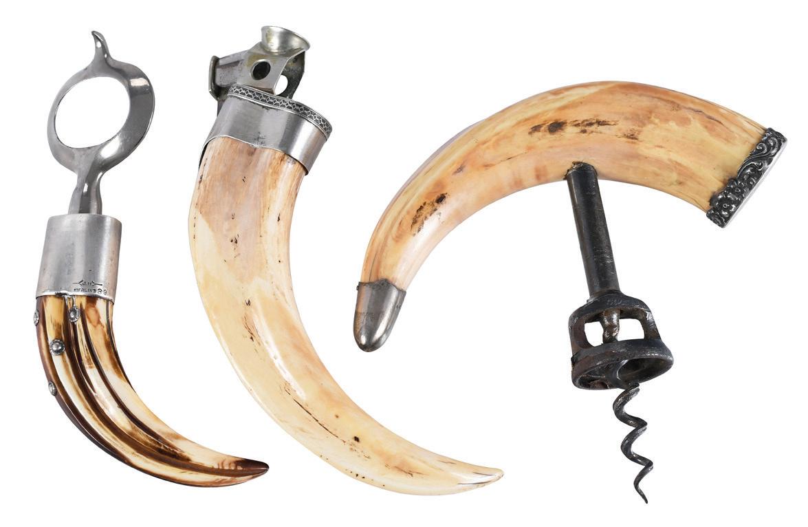 Three Silver-Trimmed Gentleman’s Articles 19th/20th century, comprising: boar’s tusk cigar cutter, end cap marked “900”; boar’s tusk corkscrew, end cap marked “Sterling”; John Hasselbring stag’s antler bottle opener, silver mount marked “J.H./Sterling 89” and neck illegibly marked; largest 5-1/4 x 5-5/8 x 1-1/4 in., good overall condition, wear commensurate with age and use, metal elements with discoloration and tarnish; cigar cutter with slight looseness to silver mount; corkscrew with corrosion