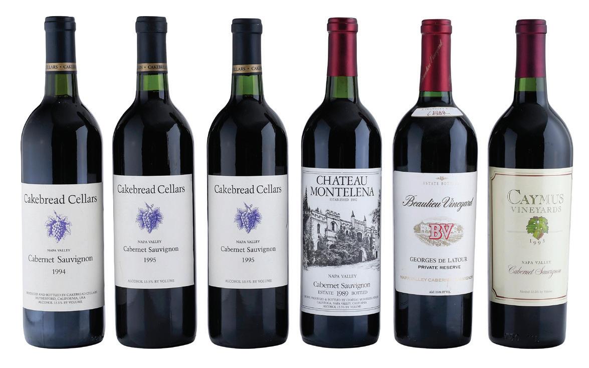 Chateau Montalena Vintage 1989, Napa Valley, California, USA, 750 ml, alcohol 13.4% by volume; BV Georges de la Tour Private Reserve Vintage 1989, Napa Valley, California, USA, 750 ml, alcohol 13% by volume; Caymus Vineyards, 1993, Napa Valley, California, USA, 750 ml, alcohol 12.5% by volume; Cakebread Cellars Vintage 1994, Napa Valley/Rutherford, California, USA, 750 ml, alcohol 13.5% by volume; two bottles Cakebread Cellars Vintage 1995, Napa Valley/Rutherford, California, USA, 750 ml, alcohol 13% by volume, three with ullage to base of neck, three with slightly depressed but firm corks, some nicks and wrinkling to capsules, labels in overall good condition with minor wear and wrinkling