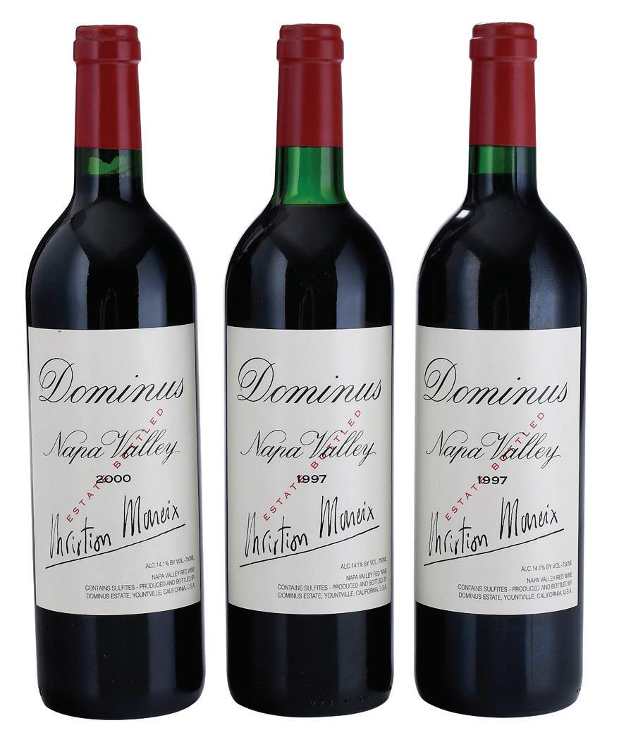 Four Bottles 1997 Select California Cabernet Sauvignon, Ridge, Beringer, and Two Dominus, Dominus Vintage 1997, Napa Valley, California, USA, 750 ml, alcohol 14.1% by volume; Beringer 1997, Napa Valley, California, USA, 750 ml, 13.8% by volume; Ridge Vineyards Geyserville, Sonoma County, California, USA, 750 ml, alcohol 14.9% by volume, each with fill into neck, Dominus and Ridge with slightly depressed but firm corks, capsules and labels in overall good condition with minor wear