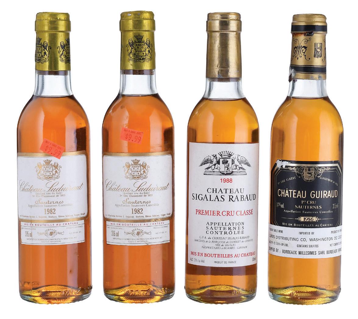 Chateau Guiraud, Vintage 1986, Sauternes, France, 375 ml, alcohol 14% by volume; two bottles Chateau Suduiraut, Vintage 1982, Sauternes, France, 375 ml, alcohol 14% by volume; Chateau Sigalas Rabaud, Sauternes, France, alcohol 13% by volume, each with ullage to base of neck, depressed corks, wrinkling, corrosion, and accretion to capsules, labels with some bin soilage and abrasions