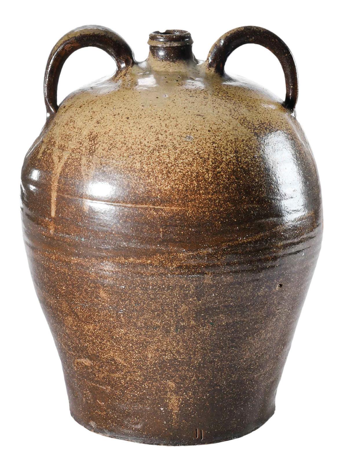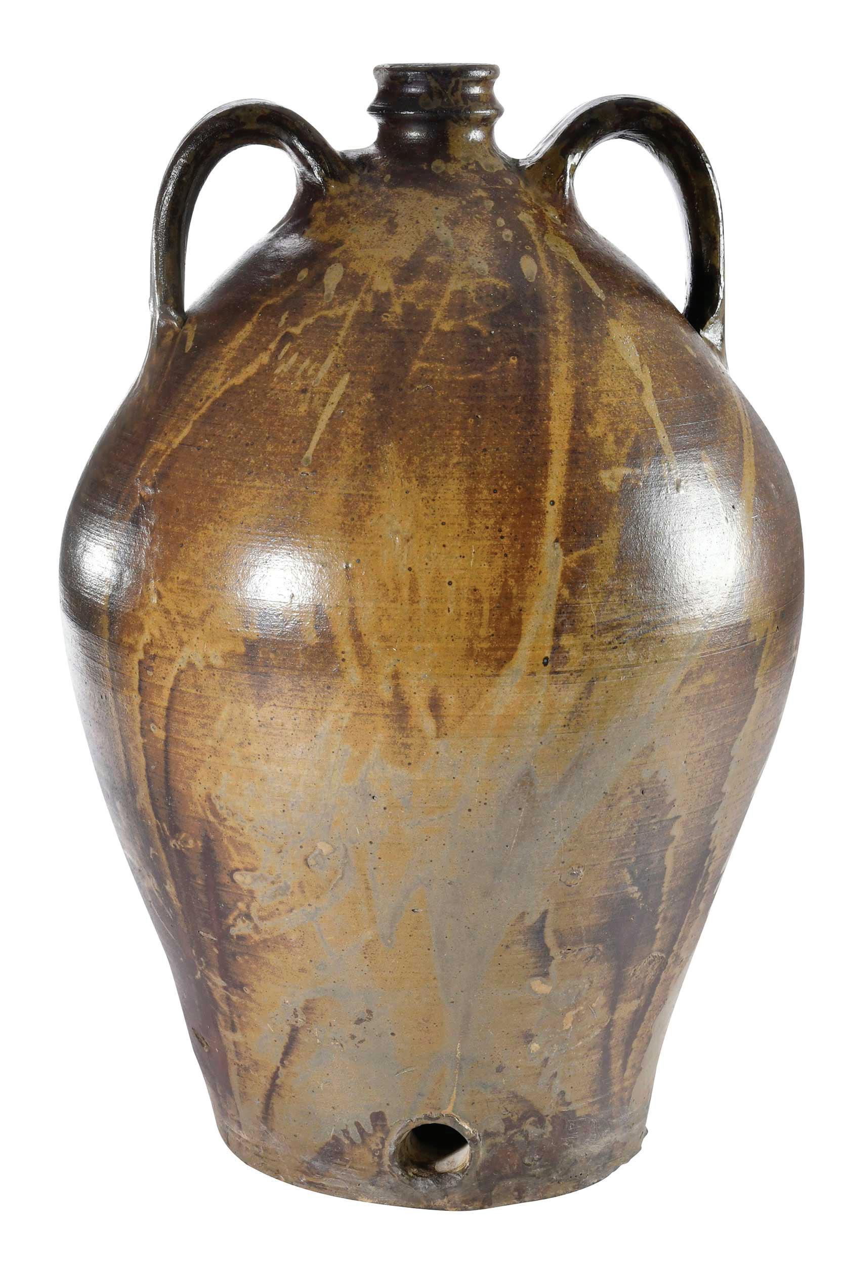 Edgefield District, South Carolina, possibly circa mid 1820s to 1840s, possibly made at a Pottersville manufactory, or a Horse Creek Valley manufactory, and possibly attributed to either A.F. Brannon or Abram, monumental tapered lower body and shoulder ovoid form, dark brown and light brown double dipped washed alkaline glaze, long glaze runs down from shoulder of jug, series of stacked line runs around the side of jug from turning jug horizontally and spinning in the glazing process, apparent 3 in. capital “AB” in the glaze to front shoulder of jug, large applied arched 7 in. x 2 in. strap handles on opposing shoulders, 2 x 2-1/2 in. collared spout, 1-1/4 in. drain hole to lower base edge, 22-1/4 in. tall, 47-1/2 in. circumference, glaze voids and anomalies as made, three quarters of right handle restored, top quarter of handle original, sealed and stabilized 14 in. hairline up from base edge right of the drain hole to mid body of jar, top half of that hairline is miniscule, neither repair illuminate under black light, light surface wear, some minor glaze frits, thin 1/2 in. and 1/4 in. clay body chips to lower body, another 1/4 in. circular glaze chip to lower body, another thin 1/4 in. clay body chip to lower body, shallow 1/2 in. rim chip, overall very good surviving example of a rare form despite restoration, great presentation