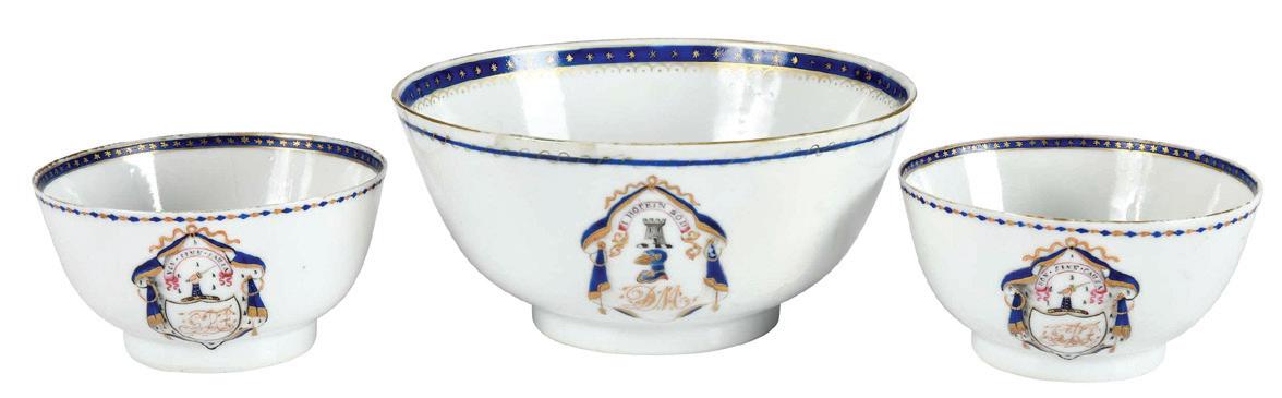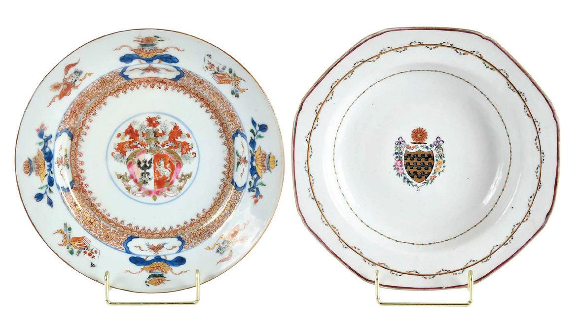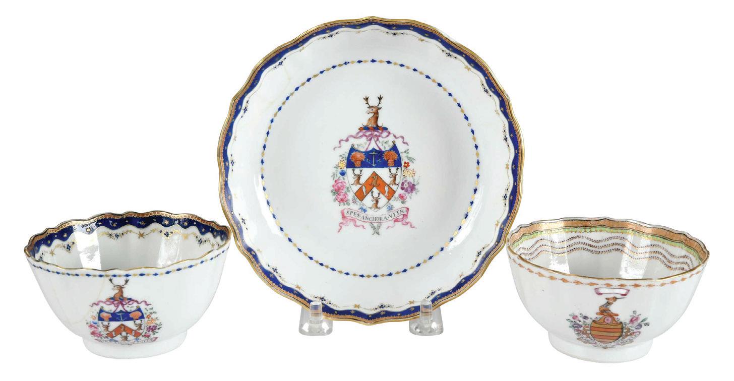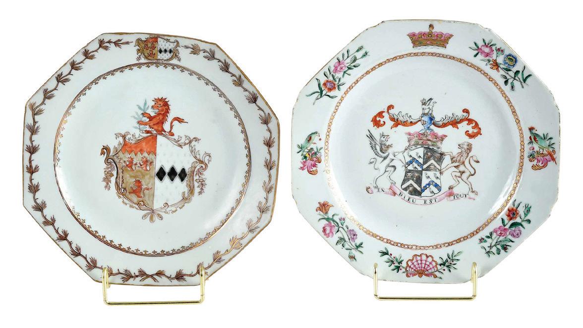 Two Chinese Export Armorial Octagonal Serving Dishes and a Punch Bowl circa 1765, octagonal dish centered with arms of Stuckey quartering Bartlett; circa 1760, octagonal dish centered with arms of Justice impaling Barbour; circa 1755, punch bowl with arms of Norris separated by floral panels; largest 5-1/4 x 12-3/8 x 12-3/8 in., anomalies, pinholes, kiln debris, and some loss to gilt/enamel; Stuckey dish with spider crack to base; Justice dish and Norris bowl with scattered repair and retouch (see blacklight), associated flaking