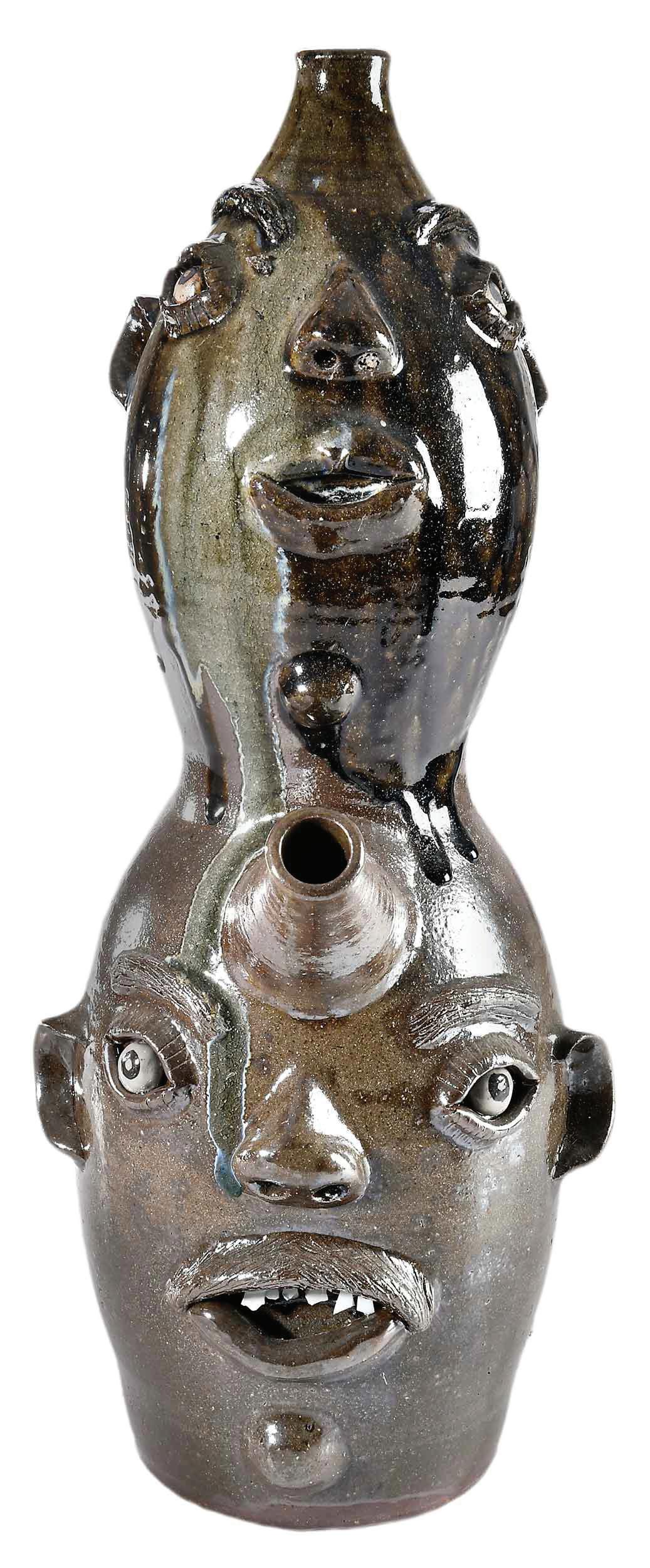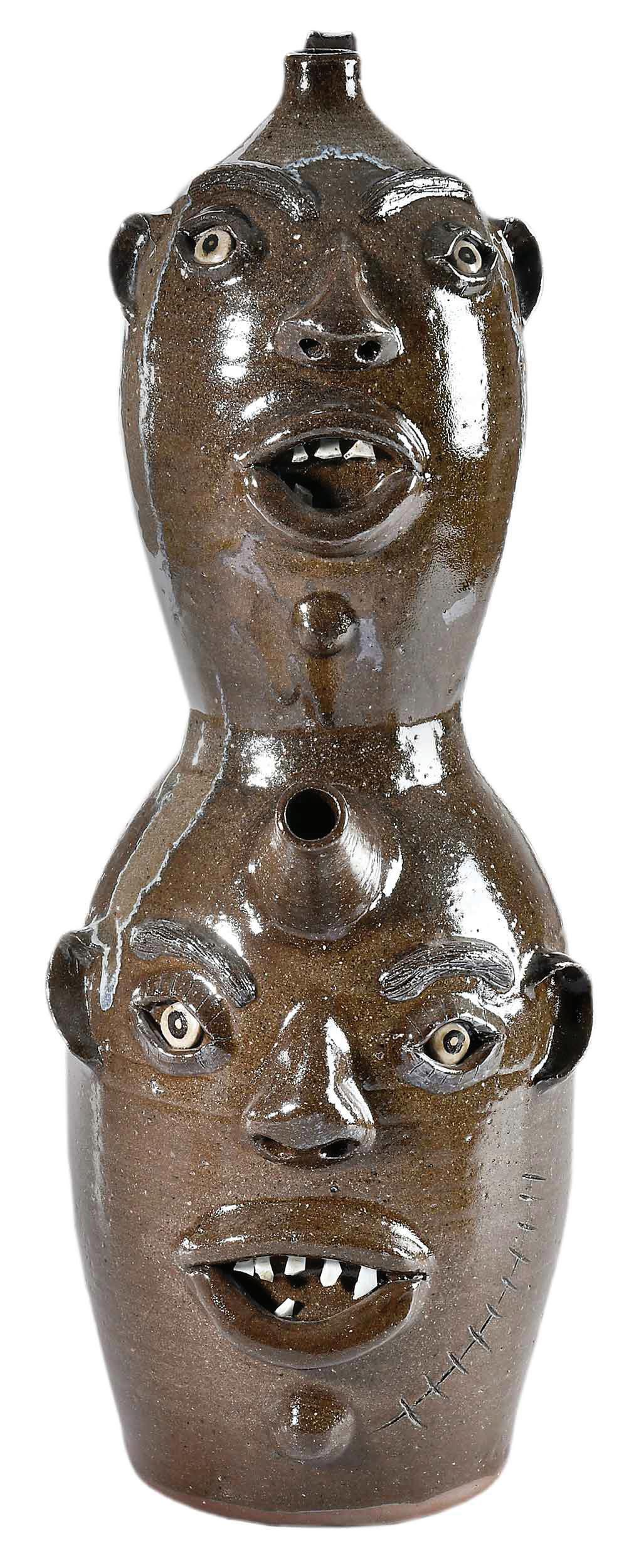 Large South Carolina Billy Henson Triple Face Monkey Jug (Spartanburg County, SC, 1941-2001) double gourd form, light olive runny green glaze variation to upper jug, brown glaze to lower jug, various melt runs with rutile highlights down from upper spout to lower jug, applied facial features, white clay eyes with brown pupils and green pupils, broken china teeth, applied strap handle with incised vine decoration, large spout above face on lower jug, incised stitch marks to left side of face, large incised “palmetto tree” between “S.C.” with “crescent moon” on back of bottom jug, inscribed on base “ Billy Henson / Lyman S.C. / Wood Fired / 9-22-99 “, 21-1/2 in. tall, glaze voids and anomalies as made, great as made condition