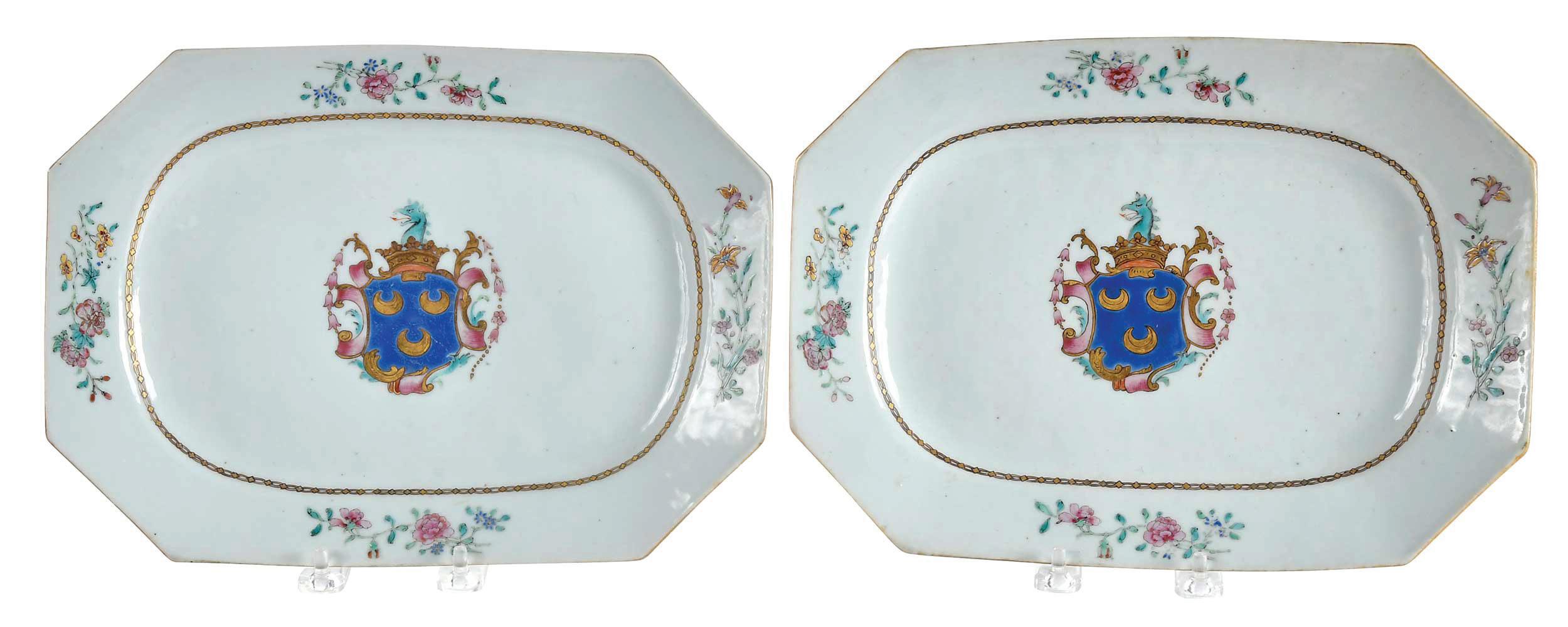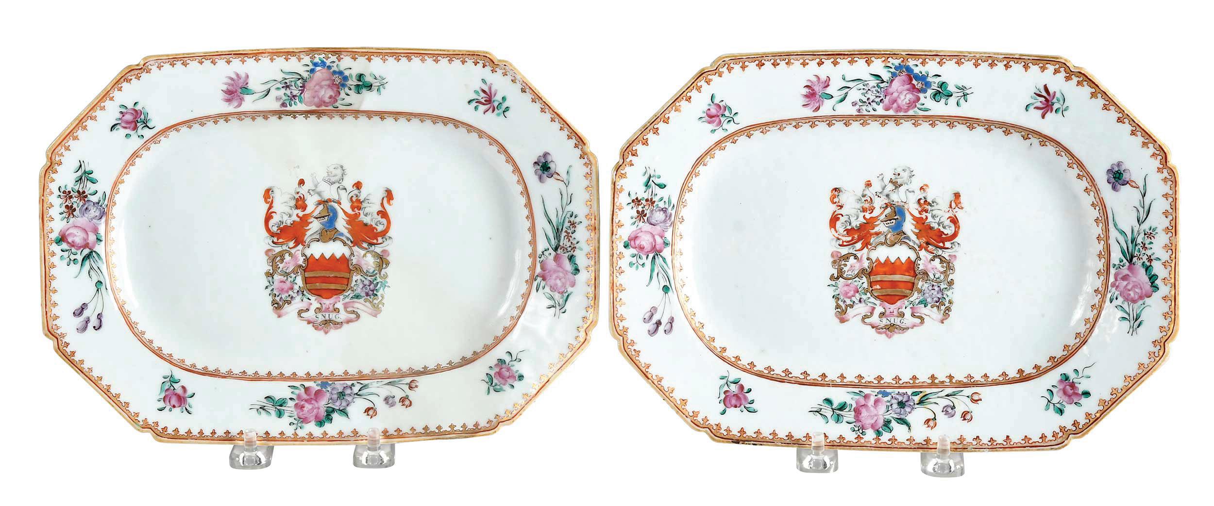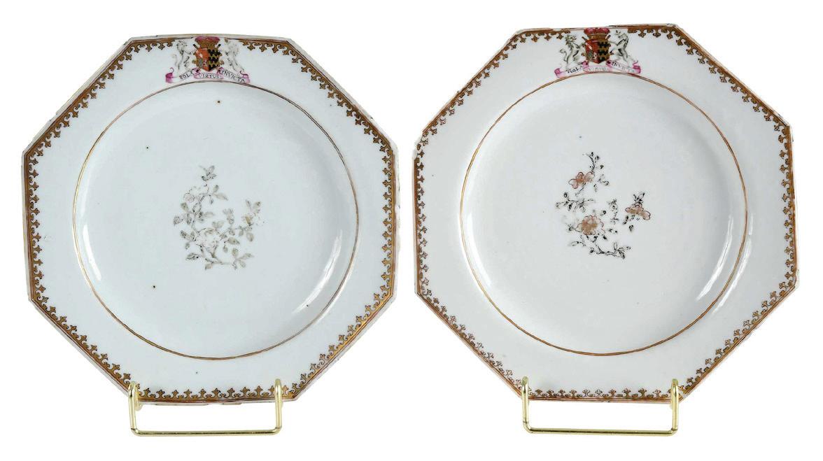 Chinese Export Armorial Porcelain Octagonal Platter with a Reproduction Platter, circa 1765, spearhead banding centering arms of Knott, 1-1/4 x 11-1/2 x 8-1/4 in.; reproduction Instituto dos Museus e da Conservacao platter centered with arms of Francisco Antonio da Veiga Cabral da Camara Pimentel, 1-1/4 x 14-1/2 x 11 in., anomalies, pinholes, and some loss to enamel/gilt; Knott platter with small repaired chip to rim
