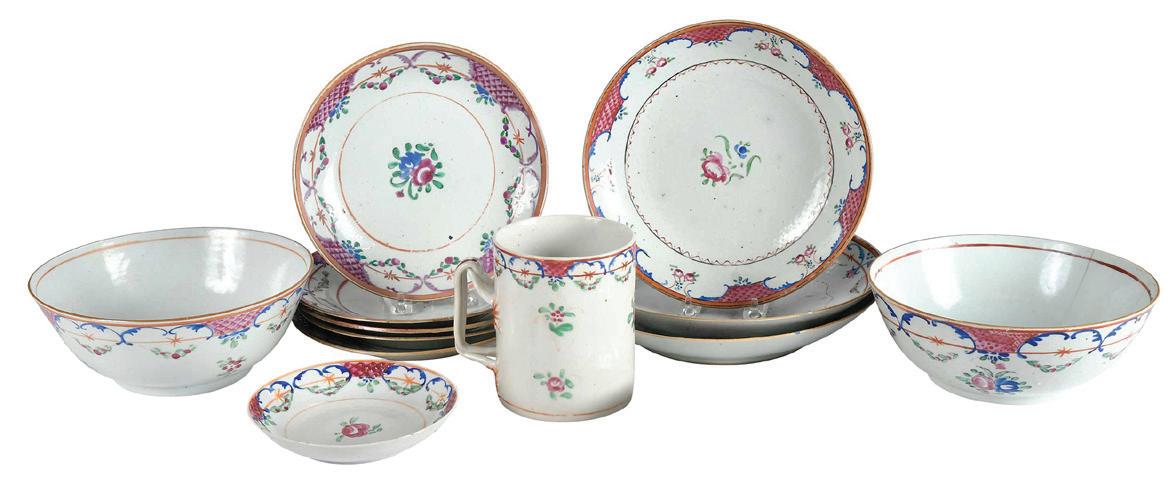 13 Piece Assembled Partial Service of Chinese Export Famille Rose Porcelain 19th century, comprising: four plates; two small dishes; one medium dish; three large dishes; two bowls; twist-handle cann; largest , wear commensurate with age and use, anomalies as made, wear and loss to enamel, areas of repair and restoration throughout; one large dish and one plate with breaks and associated repairs (see blacklight photos)
