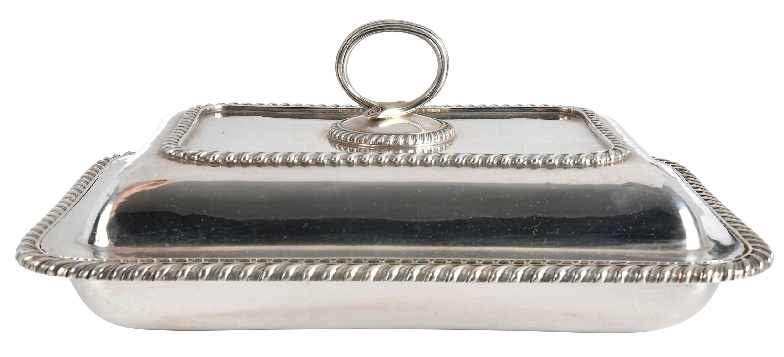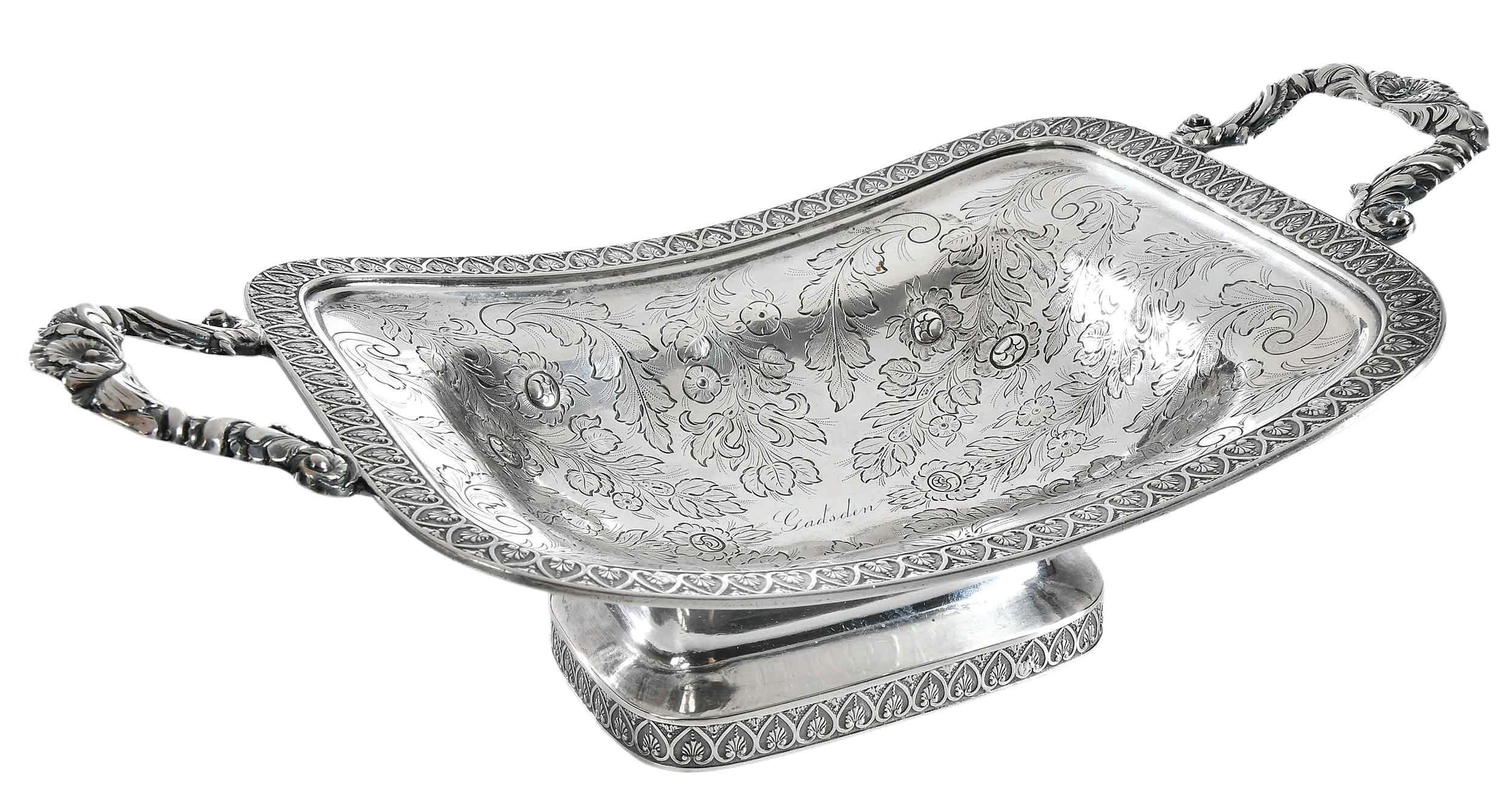 Charleston Coin Silver Basket, Nathaniel Hayden South Carolina, early 19th century, rectangular form, engraved floral decoration, applied die rolled borders, scroll handles, engraved “Gadsden”, marks for Nathaniel Hayden (Charleston, South Carolina, working 1832-1843 and New York, NY working 1843-1855), “Charleston”, 27.45 oz. T., 4-1/4 x 13 x 7 in., good condition with typical wear, partial mark