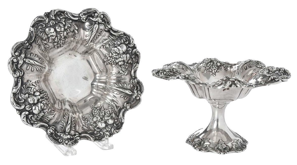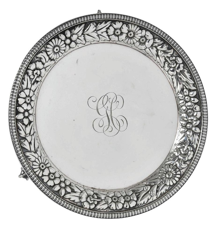 Kirk Repousse Coin Silver Footed Salver Baltimore, 1868-1890, round with floral repousse border, central cartouche monogram, back monogram “A.C.M./ Christmas./1888”, marks for S. Kirk & Son, 5.08 oz. T., 1 x 6-1/2 in., minor wear