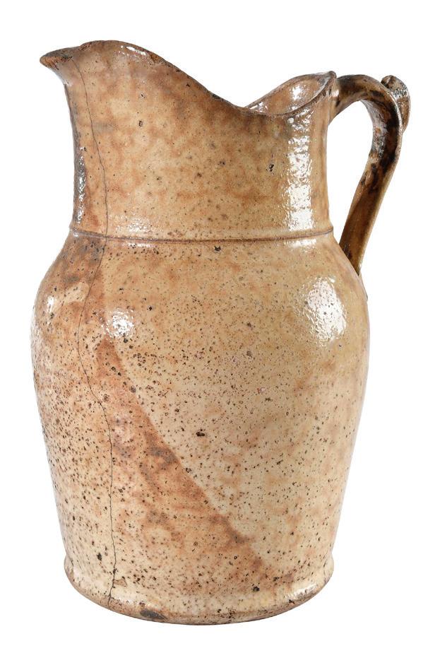 Very Rare Union County South Carolina Attributed Stoneware Pitcher possibly mid to late 1800s, creamy brownish alkaline glaze, footed base, rounded wide shoulder with tapered lower body, tooled ring around neck, very unusual downcurved shaped rim with pulled spout, applied arched strap handle with elongated thumb knob, 12-1/4 in., glaze voids and anomalies as made, evidence of heavy wear throughout, chips and flakes to entire exterior and interior glaze, 1 in. chip to spout with 12 in. hairline down to base, then 4-1/2 in. across base, wear to entire rim with some chips, wear and flakes to glaze on handle, discoloration, illumination of interior and exterior under black light due to residue