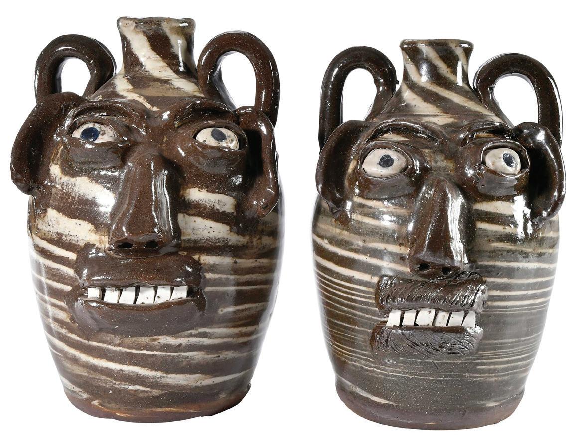 Two Burlon Craig North Carolina Stoneware Face Jugs (Vale, North Carolina, 1914-2002) brown and cream colored swirl glazes, applied facial features, inset white clay eyes with cobalt pupils, arched strap handles, banded wavy line decoration to back shoulder of jar, smaller jug with articulated mustache, larger jug inscribed “B.B.C.” at shoulder, the smaller one stamped “B.B. CRAIG, VALE, N.C.” on base, 11-3/4 and 12-1/4 in., glaze voids and anomalies as made, larger jug with area of chips to base edge, otherwise both in good condition