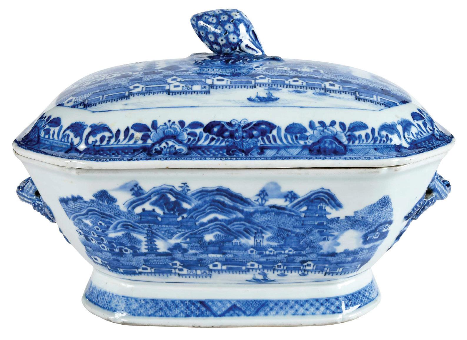 Rare Chinese Export Porcelain Lidded Tureen Depicting The City of Guangzhou late 18th century, underglaze blue decoration depicting a walled city with pagoda style buildings, seaside warehouses and boats, diaper borders with foliage and butterflies, double strap twisted handles, strawberry form finial on lid, 8-1/4 x 13-1/4 x 8-1/2 in., firing flaws and anomalies including glaze voids, pinholes throughout, and firing cracks at handles, some small losses to glaze at one handle, retouch along interior rims and a few scattered areas throughout
