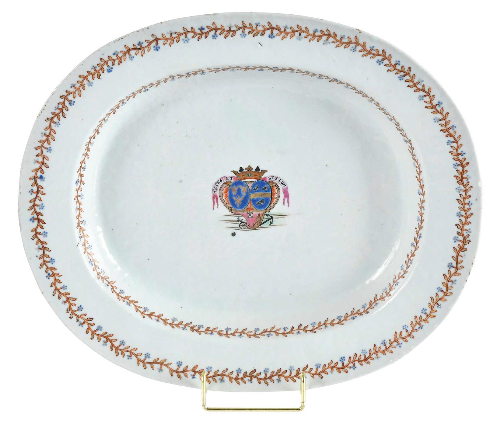 Large Chinese Export Armorial Porcelain Oval Platter, Rolland du Roscoat, circa 1788, vines centering accolée arms of Rolland du Roscoat, Knight of the Saint Louis, motto reads “Artes Et Bellum”, 2 x 15 x 12-1/2 in., anomalies, pinholes, kiln debris, and some loss to gilt/enamel, some chipping to rim