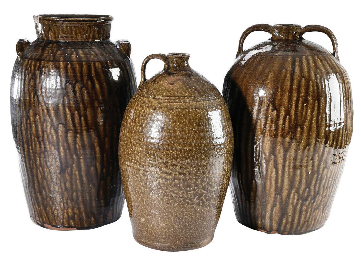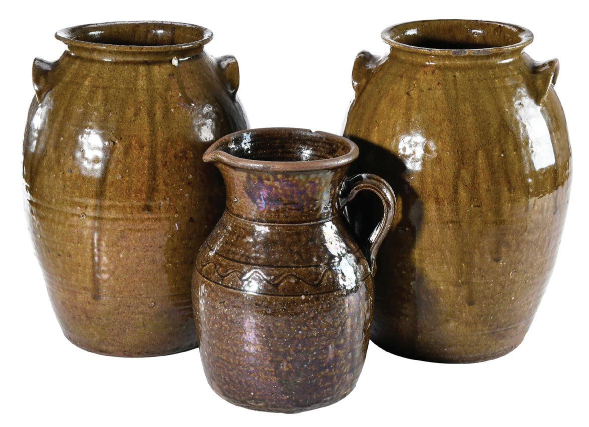 Three Pieces of North Carolina Catawba Valley Pottery late 19th, early 20th century, two storage jars with runny green alkaline glaze, ovoid forms, small incised “2”s at shoulder, small lug handles, flared rims, 12-1/4 in. and 12 in.; pitcher, mottled dark olive green alkaline glaze, wavy line banded decoration at shoulder, incised line at neck, applied arched ridged strap handle, flared rim and pulled spout, 9-1/4 in., glaze voids and anomalies as made, surface wear and abrasions, base wear, one jar with 1/2 in. and 3/4 in. rim chips, the other with 3/4 in. rim chip and 1/2 in. handle chip and small frit, other rim wear and tiny frit, pitcher with 1/4 in. rim loss, firing separation in handle as made, 1/2 in. chip to side of handle