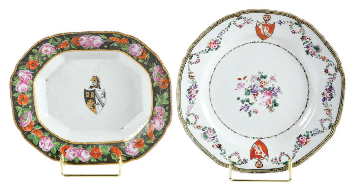 Two Chinese Export Armorial Porcelain Dishes circa 1810, wide floral band centering arms of Smyth impaling Denison, 1-1/2 x 9 x 7-7/8 in.; circa 1775, flower festoons centering floral decoration, the arms of Stevenson with Cockayne (or Cockburn) in pretence in the border, 1-1/4 x 9 x 9 in., anomalies, pinholes, glaze voids, and some loss to gilt/enamel; Stevenson plate with area of repair/retouch to rim