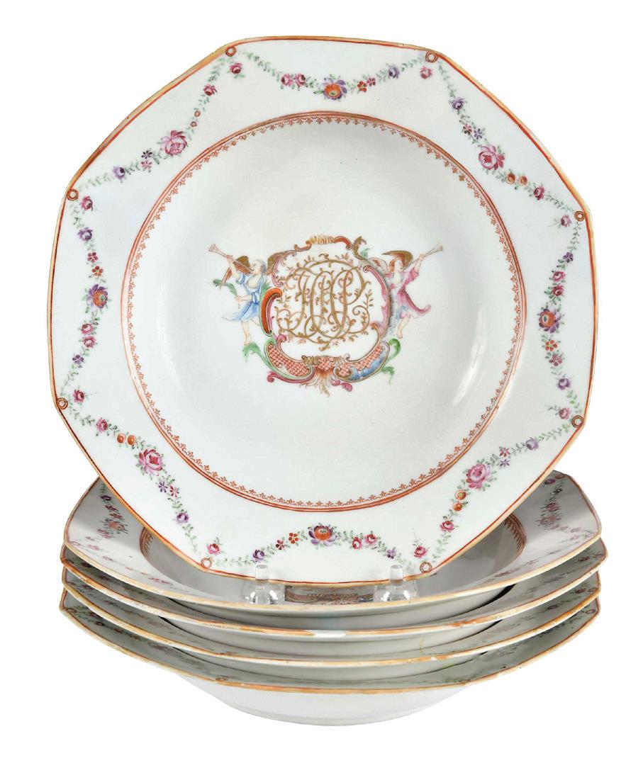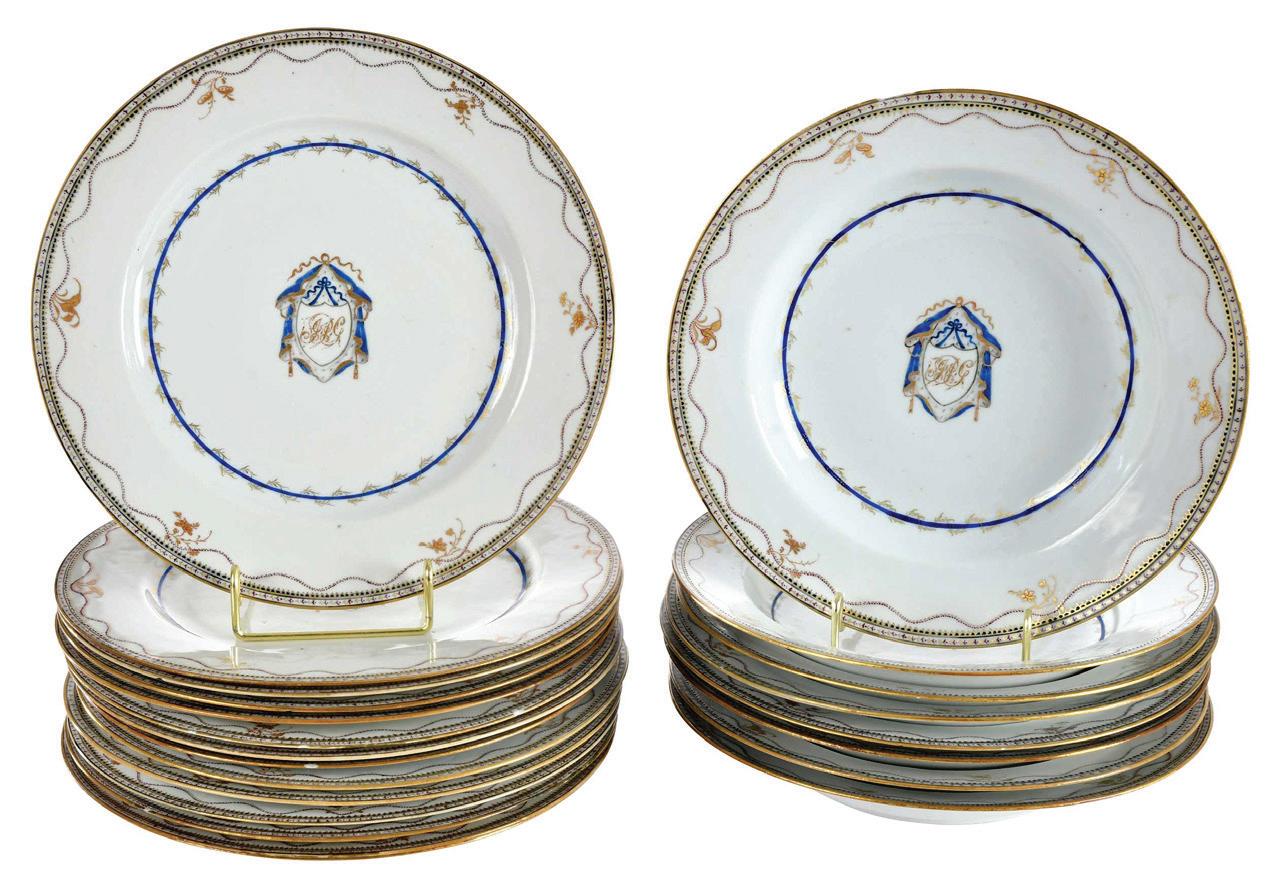 Set of 22 Chinese Export Monogrammed Porcelain Dishes 18th/19th century, each with enamel and gilt scroll bands centering shield with monogram “JPC (?)”, comprising: eight soup bowls, 1-5/8 x 9-3/4 x 9-3/4 in.; 14 dinner plates, each approximately 3/4 x 10 x 10 in., anomalies, pinholes, and some loss to gilt/enamel, some chips and hairlines to rims; two plates with chips and repairs to rims