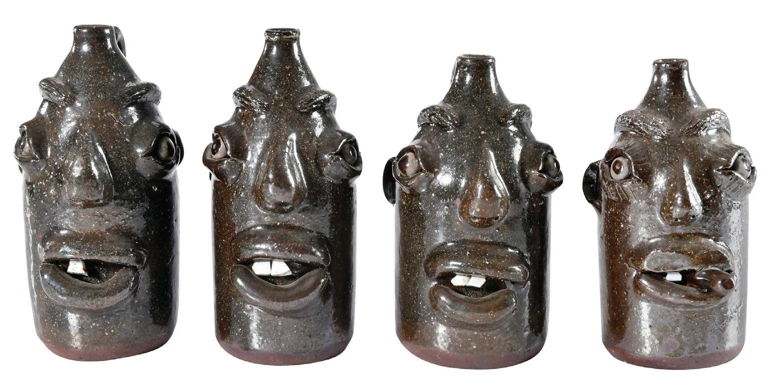 Four Jeff Young North Carolina Stoneware Face Vessels (Vale, North Carolina, contemporary) all with runny olive green alkaline glazes, one jug with purplish brown runs, applied facial features, broken china teeth, inset white clay eyes with cobalt pupils, applied ridged strap handles, jugs with incised banding on spouts, all with impressed “JY” mark near base edge, sizes 8-1/4 to 10 in., glaze voids and anomalies as made, great as made condition