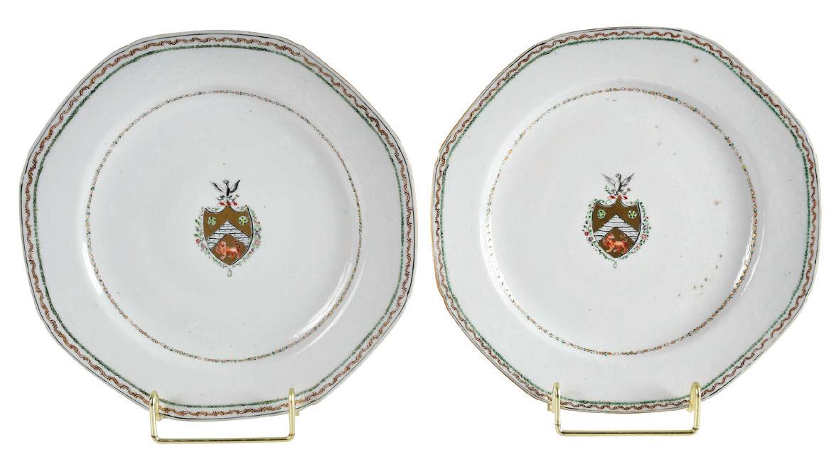 Pair of Chinese Export Armorial Octagonal Plates, Richter alias Rider circa 1785, green enamel and gilt bands centering arms of Richter alias Rider, 7/8 x 9-1/4 x 9-1/4 in., anomalies, pinholes, and some loss to gilt/enamel, some minor chips to rims