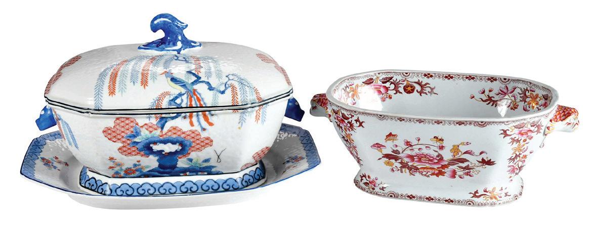 Large Chinese Export Armorial Porcelain Tureen and Underplate circa 1760, floral sprays and gilt spearhead with arms of Edwardes, tureen with pomegranate finial and rabbit head handles, 8-1/2 x 9 x 13-3/4 in.; underplate 2-5/8 x 12-1/2 x 16-1/2 in., good overall condition, wear to gilt and enamel, anomalies as made, areas of fluorescence to lip of tureen and lid and face of underplate (see blacklight photos)