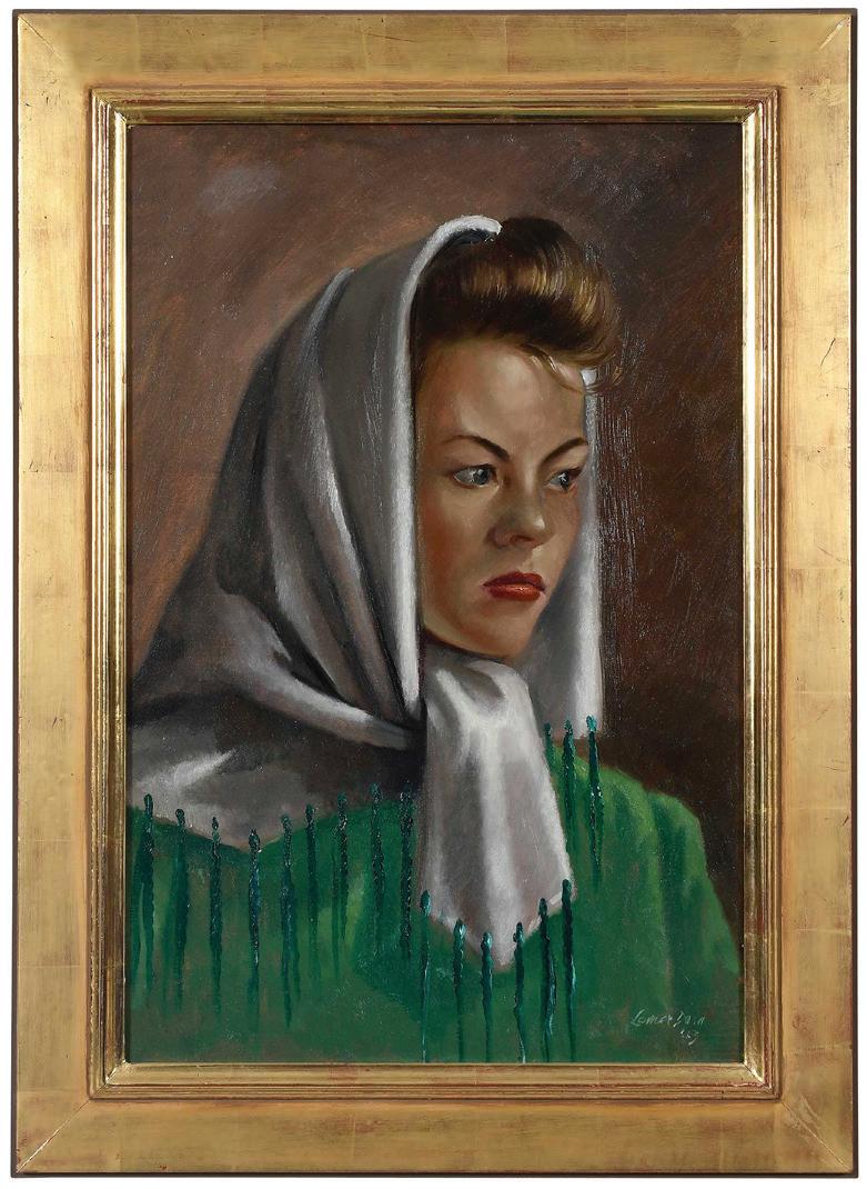 Jo Anne Cannon, 1943, signed and dated lower right “Lamar Dodd ‘43”, oil on canvas, 24 x 16 in.; gilt wood frame, 29-1/8 x 21-1/4 x 2 in., retouch upper left corner, light surface dirt; frame with light wear