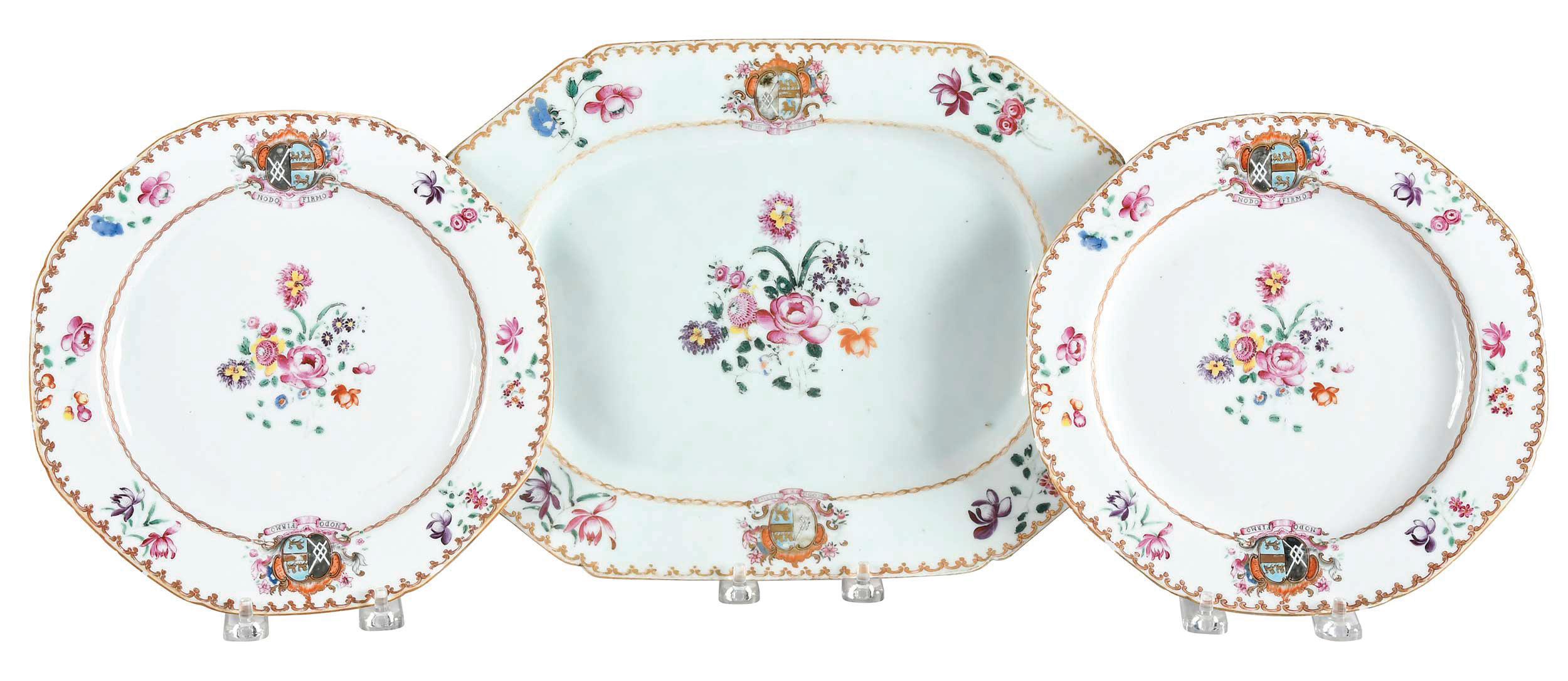 Three Pieces of Chinese Armorial Export Porcelain, Harrington impaling Rockley circa 1755, floral sprays and gilt spearhead and chain centering a floral spray, the arms of Harrington impaling Rockley and motto “Nodo Firmo” in the border, largest 1 x 9-7/8 x 13 in., anomalies as made, some loss to gilt and enamel; plates with multiple chips to rims; platter with glaze void or old chip to rim