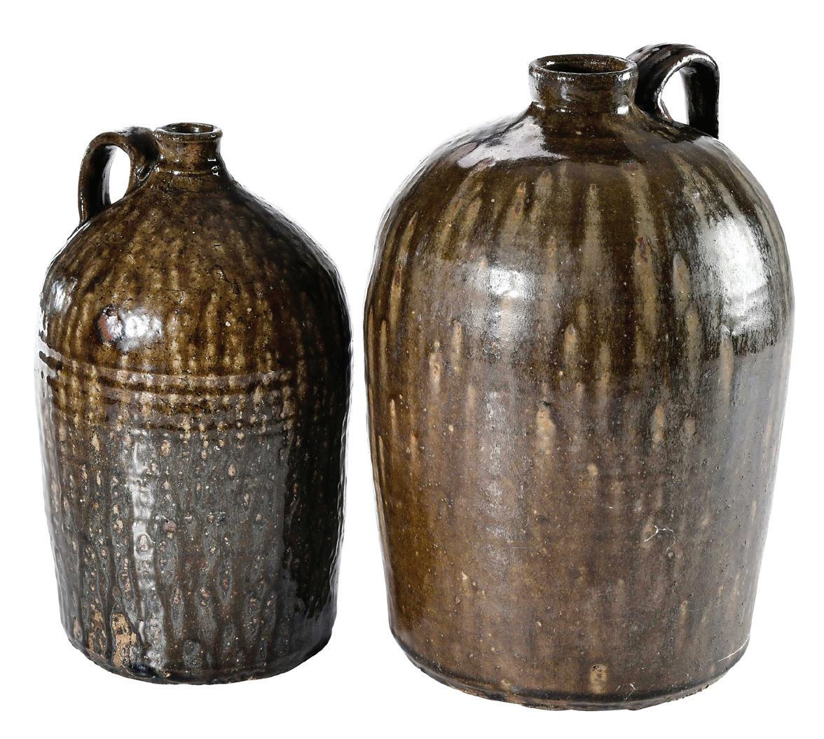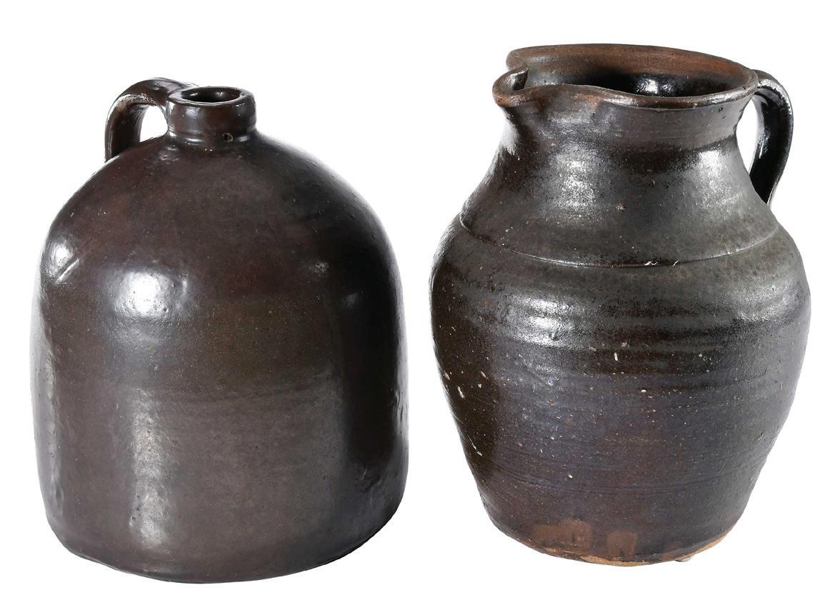 Two Pieces of Southern Stoneware mid to late 1800s, jug with yellowish mottled runny green alkaline glaze, tapered ovoid form, arched looped applied strap handle, incised rings at shoulder, collared spout, possibly SC, Georgia, or Alabama, 15-1/2 in.; tannish alkaline glazed storage jar, rutile in interior, swell at mid body, tooled downturned rim, possibly Edgefield or Alabama, 8-1/2 in., glaze voids and anomalies as made, surface wear and abrasions, wear to base edge, jug with wear and chips to rim, various glaze frits, jar with three 1 in. rim chips, other smaller rim chips, 2 in. and 2-1/2 in. hairline down from rim, 2-1/2 in. “Y” hairline up from bottom kiln debris, two 1 in. and one 1/2 in. areas of glaze loss to lower body of jar, residue
