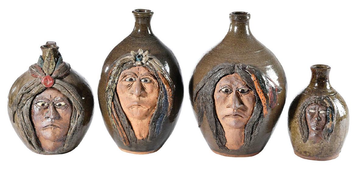 Four Hal Dedmond North Carolina Native American Stoneware Face Jugs (Lawndale, North Carolina, contemporary) all with green alkaline glazes, three with melt runs down from spouts and handles, finely articulated sculpted Native American faces, inset white clay eyes, applied articulated hair, various types of colored feathered headdresses, incised banding at shoulders, applied strap handles, various style spouts, inscribed on bases “Hal Dedmond...” with various dates, sizes 7 to 11 in., glaze voids and anomalies as made, second smallest with loss to tip of headdress feather and 3/8 in. chip to eyebrow with base edge wear, second largest with pebble loss to shoulder as made, otherwise great as made condition