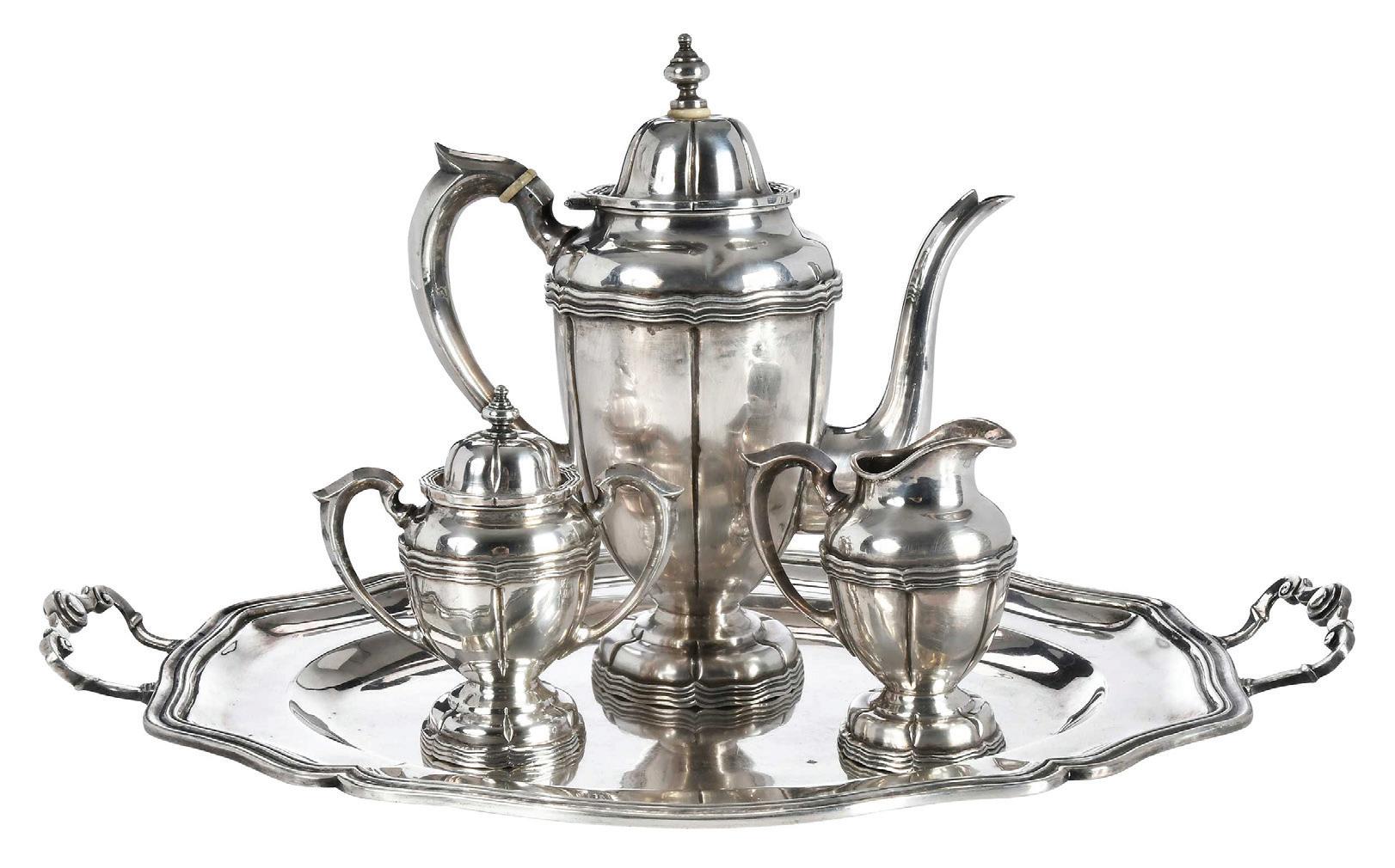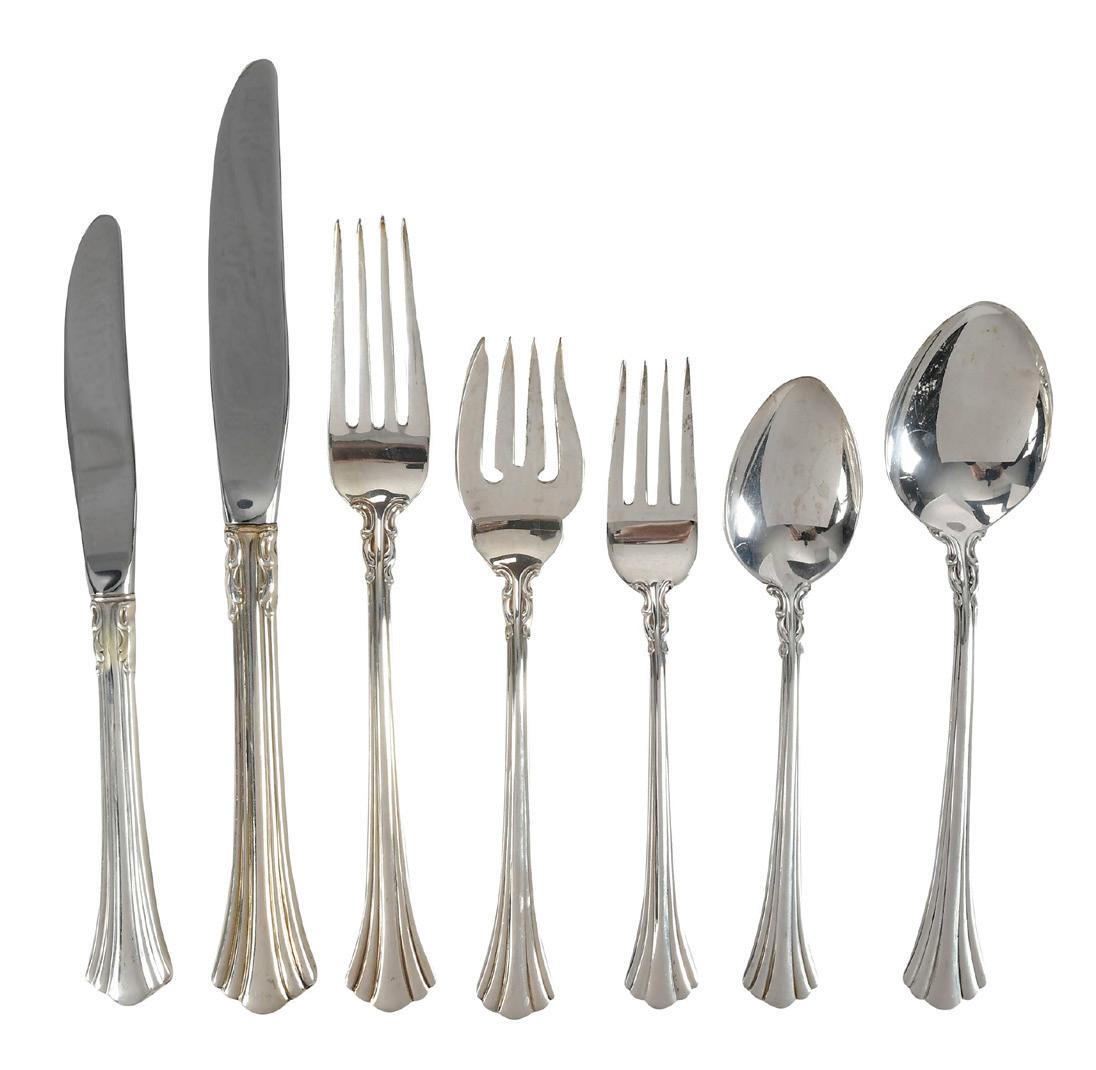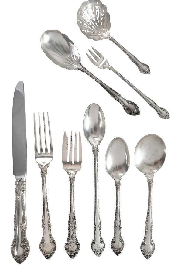 American, 20th century including eight hollow handle knives; eight teaspoons; two ice tea spoons; seven demitasse spoons; seven ice cream forks; six solid handle spreaders; three serving forks; two large berry bowl serving spoons; slot serving spoon; four bon bon; jelly server; sugar spoon; serving spoon with egg shape bowl; small serving spoon with egg shape bowl; small slotted serving spoon; sugar tongs; ice tongs; two pickle forks; hollow handle bottle opener, some monograms, all with marks for Kirk & Son, 67.9 oz. T. excluding hollow handle pieces, average wear