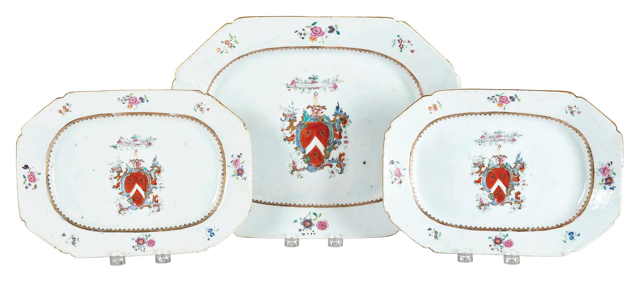 Three Chinese Export Armorial Platters, Aberdeen, circa 1760, floral sprays and gilt spearhead centering arms of Aberdeen with motto “Intemerata Fides”, largest 1-3/4 x 11-3/8 x 14-5/8 in., good overall condition, some wear and loss to gilt and enamel; smaller examples with small chips to rims