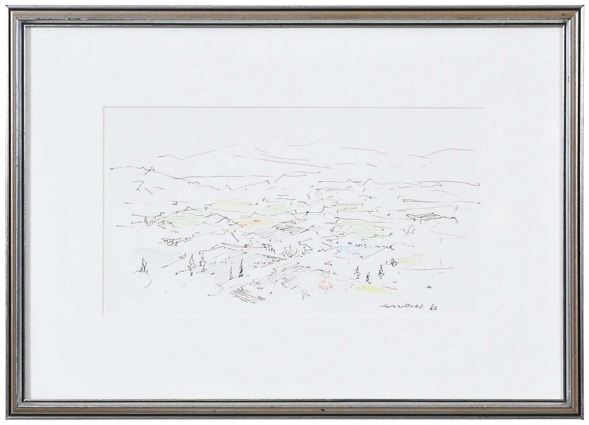 View from the Hills - Cortona, 1986, signed and dated lower right “Lamar Dodd ‘86”, ink and color pencil on paper, sight 7-1/2 x 13-5/8 in.; silver gilt wood frame, 14-7/8 x 20-3/4 x 1 in., not examined out of sealed frame, in overall good condition; frame with light wear, mat liner with with some surface dirt, small areas of foxing