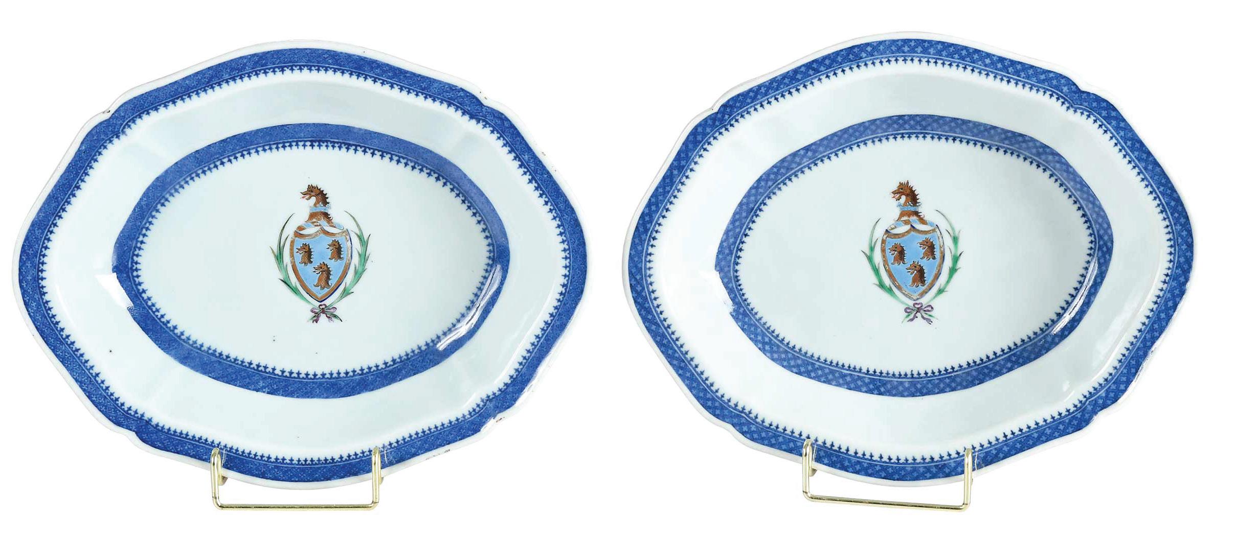 Pair of Chinese Export Armorial Oval Dishes, Stratton or Slaughter circa 1795, cobalt and gilt bands centering arms of Stratton or Slaughter, 1-5/8 x 11-3/4 x 9-3/8 in., anomalies, pinholes, glaze voids, and some loss to gilt/enamel, slight chipping to rims