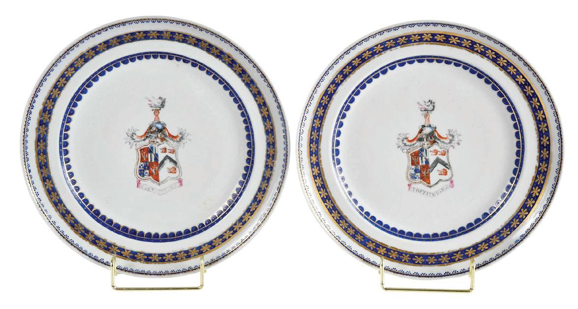 Two Chinese Export Armorial Porcelain Plates, Annesley and Cure, circa 1795, vine banding centering arms of Annesley, Earl Annesley atop motto reading “Virtutis amore”, 1-1/4 x 9-3/4 x 9-3/4 in.; circa 1790, underglaze blue diapering centering arms of Cure, 1-1/8 x 9-1/2 x 9-1/2 in., anomalies, pinholes, kiln debris, and some loss to gilt/enamel, both plates with repair and retouch (see blacklight)