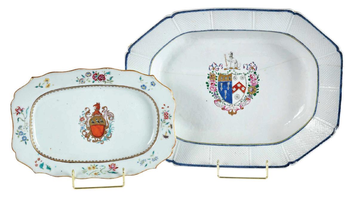 Two Chinese Export Armorial Porcelain Serving Dishes circa 1755, floral sprays and spearhead centering arms of Lovelace, 1 x 10-3/4 x 7-1/4 in.; circa 1775, underglaze blue and enamel bands centering arms of Watts impaling Carter atop motto reading “Pour la foy”, 2-1/2 x 14-1/4 x 10-5/8 in., anomalies, pinholes, and some loss to gilt/enamel; Lovelace with small chip to left rim; Watts with large hairline and staple repairs to base