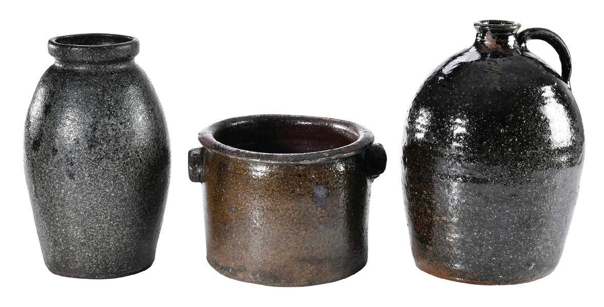 Three Pieces of North Carolina Pottery late 19th early 20th Century, canning jar, ovoid form, black speckle glaze, curved neck, straight rim, lid ledge, Donkel pottery, 10-1/2 in.; jug, shiny speckled runny black glaze, “2” incised at shoulder, ridged strap handle, flat rim, possibly Hartsoe, Catawba Valley, 11-1/4 in.; cream riser, olive green and black alkaline glaze, arched lug handles, two slash marks, down turned rim, Catawba Valley, 6-1/2 x P in., glaze voids and anomalies as made, base edge wear, surface wear, residue to exterior of jar, good condition, 1/2 in. rim chip to jug, cream riser with unstabilized 16-1/2 in. hairline around base, two 2-1/2 in. rim chips, and 1 in. rim chip, other smaller rim chips and chips to one handle handle, base wear