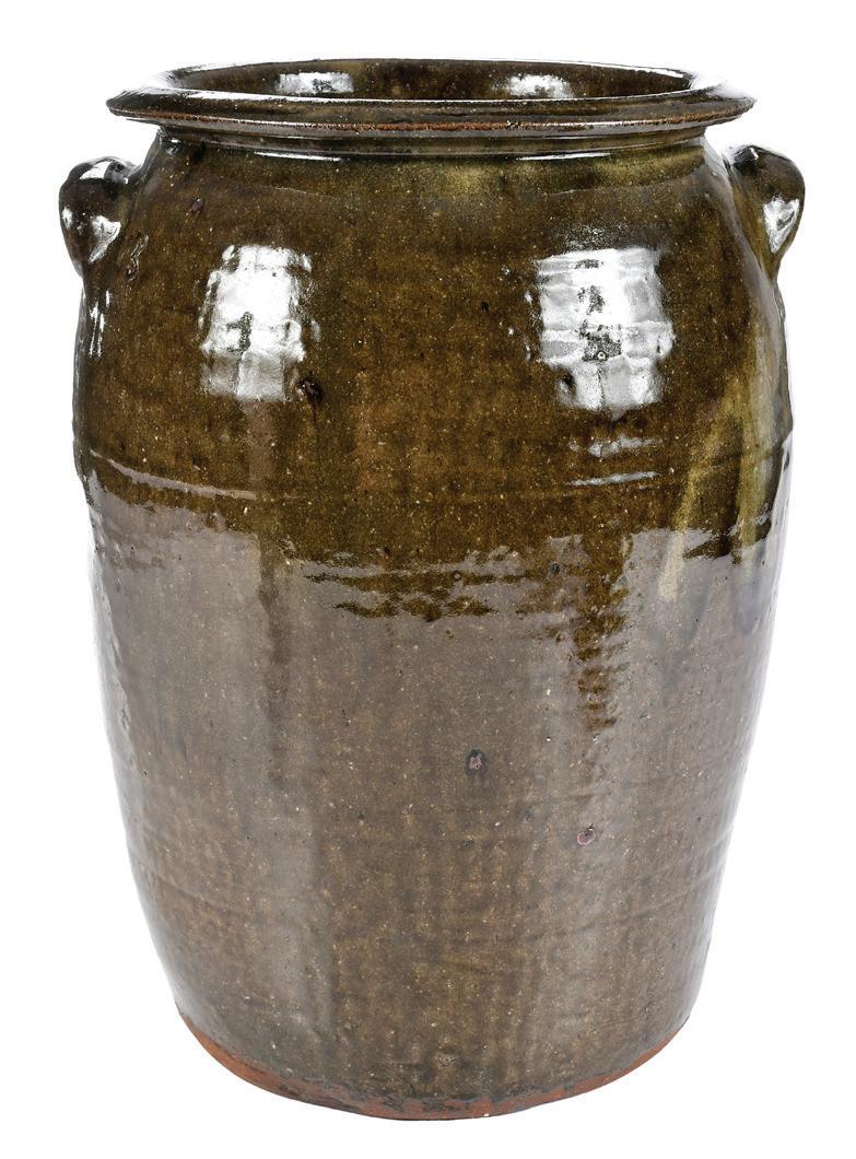 Unusual Seagle School Catawba Valley North Carolina Storage Jar (Lincoln County, North Carolina, circa 1850s) dark olive green runny mottled alkaline glaze, tapered ovoid form, small stamped “6” at shoulder, applied curved down angled lug handles at shoulder, tooled angled flat rim, 14-1/4 in., glaze voids and anomalies as made, surface wear and abrasions with glaze frits, 3/4 in. pebble loss, glaze chip to interior rim, interior and exterior rim wear with small glaze chips, 3/4 in. chip to one handle