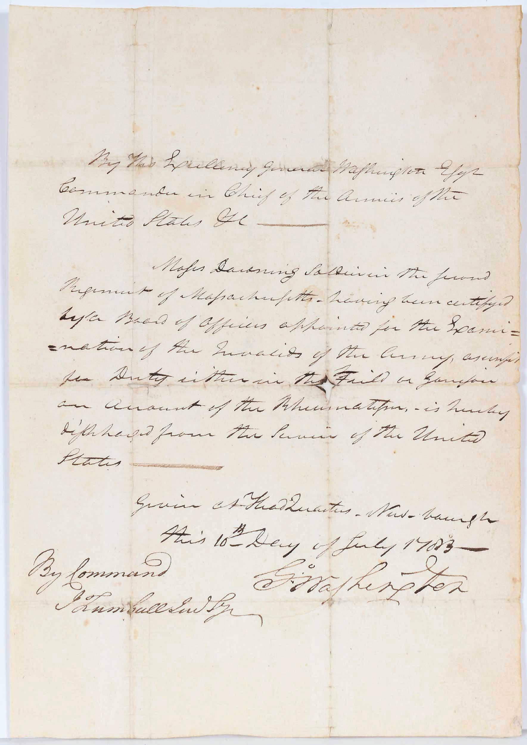George Washington Signed Medical Discharge, Moses Downing transcription: By His Excellency General Washington Esqr / Commander in Chief of the Armies of the / United States &c / Moses Downing, soldier in the second / Regiment of Massachusetts, having been certified / by a Board of Officers appointed for the Exami= / =nation of the Invalids of the Army, as unfit / for Duty either in the field or garrison / on account of the Rheumatism, is hereby / discharged from the service of the Unites States. / Given at Headquarters, Newburgh / This 10th Day of July 1783 / By Command / Jonathan Trumbull / G. Washington [signature], the docket on the back of the document reads “Moses Downing Discharge”, overall 11-1/4 x 8 in., toning, foxing, visible tape repair at back, small paper loss at fold intersections, possibly trimmed margins
