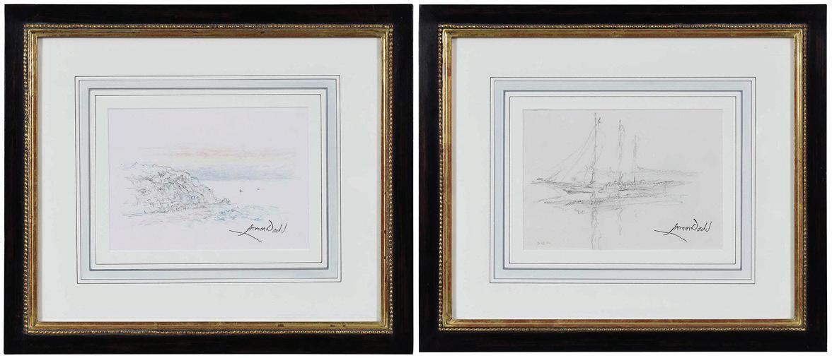 Blackhead, Monhegan, no. 424, signed lower right “Lamar Dodd”, ink and color pencil on paper, sight 6-3/4 x 9-3/8 in.; Three Masted Boat, no. 422, 1991, signed lower right “Lamar Dodd”, dated lower left “9-13-91”, charcoal and ink on paper, sight 6-1/2 x 9-3/8 in.; matching modern gilt wood frames, 16-1/2 x 19-1/4 x 3/4 in., not examined out of sealed frames, overall good condition, “Masted Boat” with slight waviness, upper left with slight exposure to paper edge out of mat liner; frames with abrasions, some chips