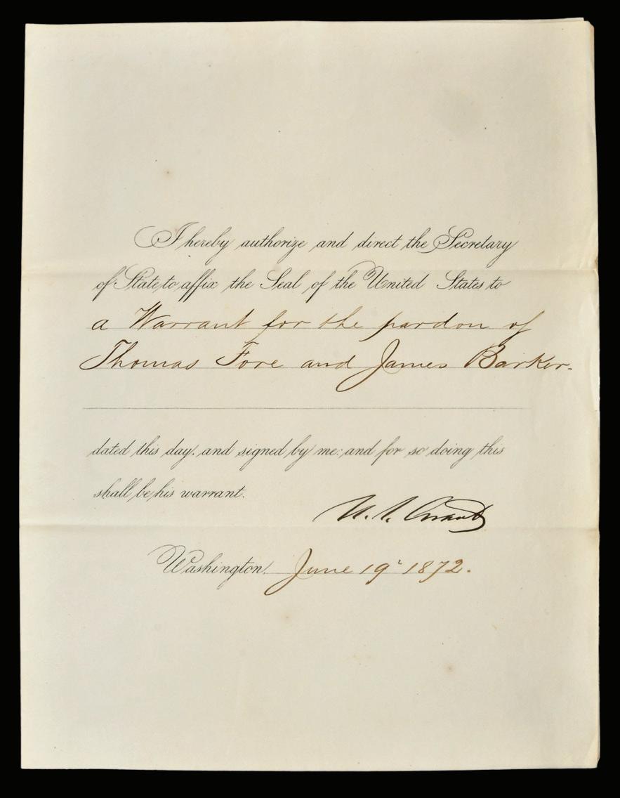 Ulysses Grant Signed Official Decree For Pardon for Thomas Fore and James Barker, dated June 19, 1872, signed “U.S. Grant”, folio, 11 x 8-1/4 in. (folded), toning, folds, minor edge wear