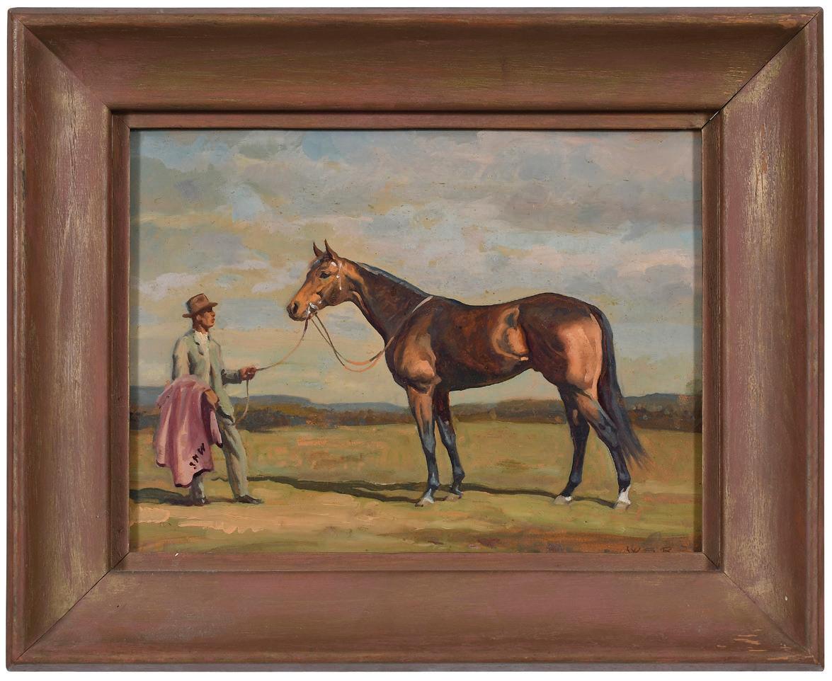 Tom Fool with Trainer, John Gaver, blanket with monogram for owners John Hay Whitney and Joan Whitney (Payson), signed lower right with monogram “W.S.B”, oil sketch on “Bone Board artist board, 12 x 9 in.; painted wood frame, 12-7/8 x 16 x 2 in., surface dirt; frame with flaking