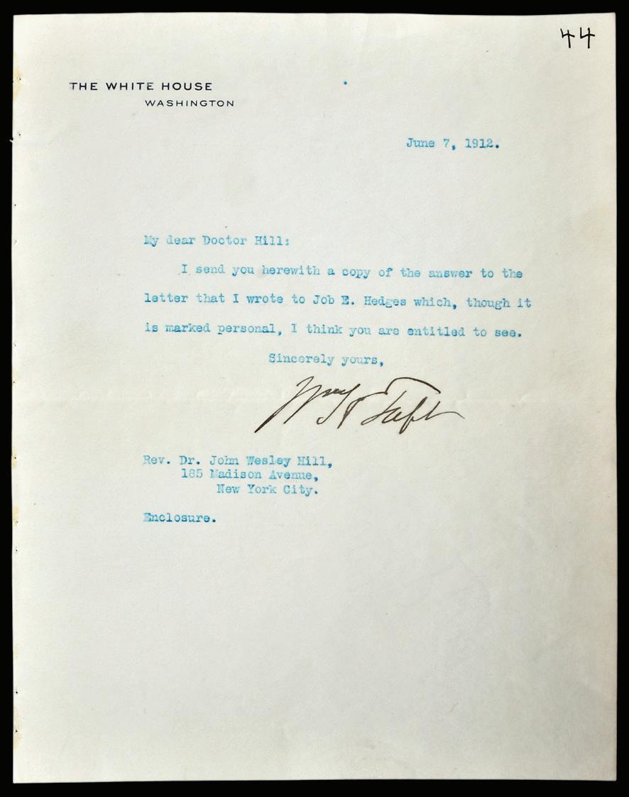 William Howard Taft Typed White House Letter Signed on official stationery, 1912, to Dr. John Wesley Hill, signed “Wm. H. Taft”, 8-3/4 x 6-3/4 in., toning, folds, pinholes at left margin, was likely folio and cut down