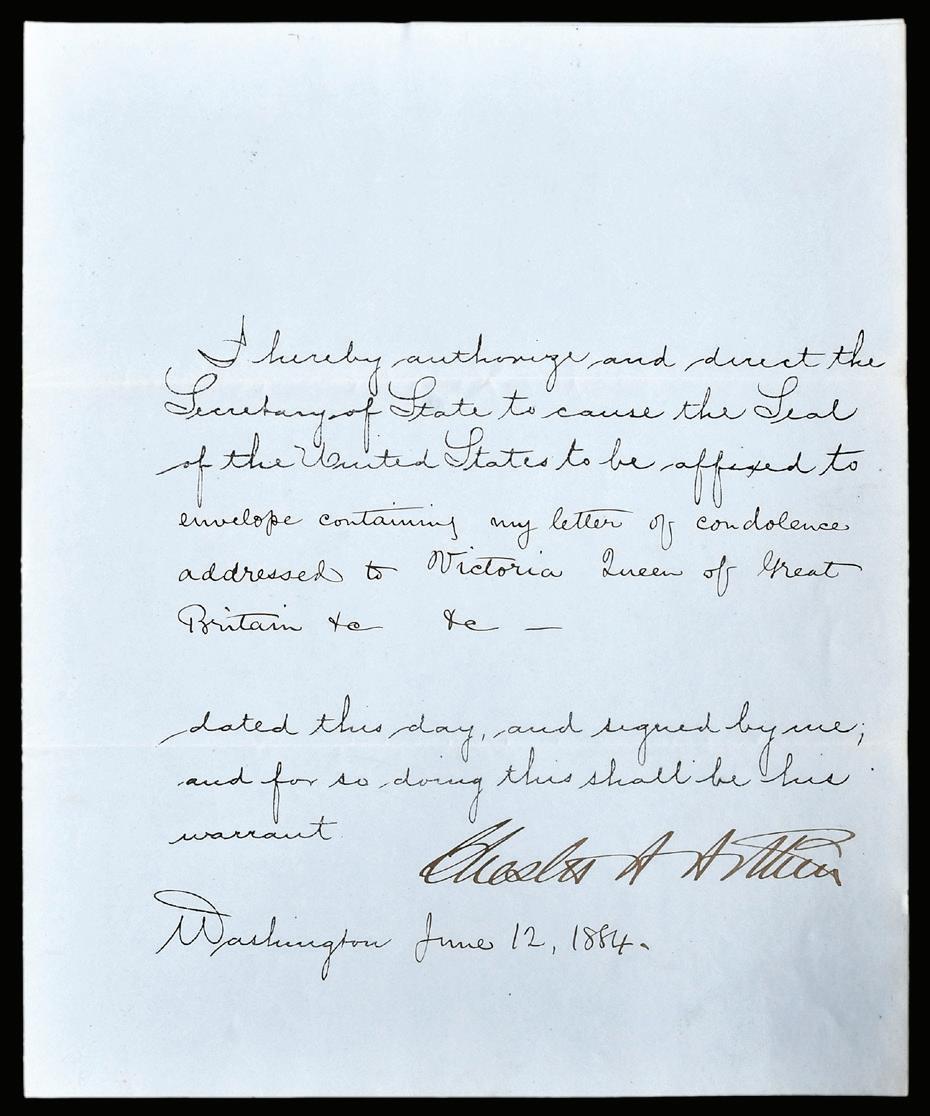 Chester Arthur Signed Official Decree For Condolence to Queen Victoria of Great Britain, dated June 12, 1884, likely having to do with the death of her son, Leopold, on blue paper, signed “Chester A. Arthur”, folio, 10 x 8 in. (folded), mild toning and folds