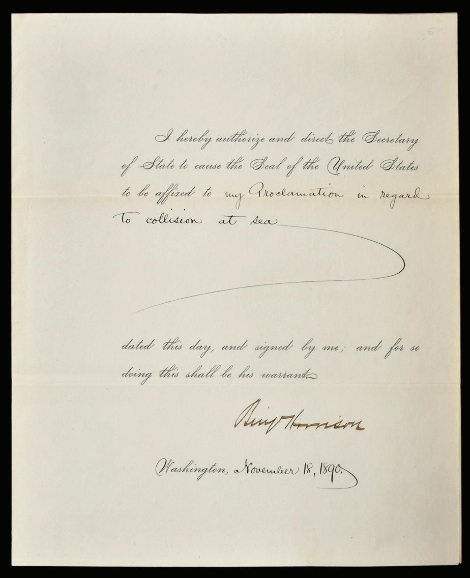 Benjamin Harrison Signed Official Decree proclamation with regard to a collision at sea, dated November 18, 1890, signed “Benj Harrison”, folio, 10 x 8 in. (folded), toning, folds