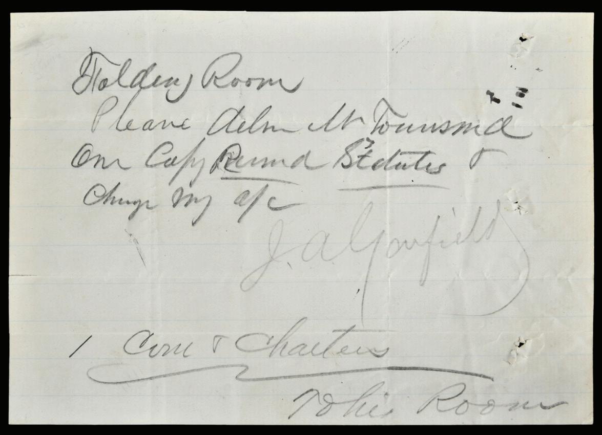 James Garfield Short Handwritten and Signed Note informal note of unclear intent, undated, on lined paper, signed “J.A. Garfield” in pencil, 5 x 7-1/2 in., toning, folds, scattered holes