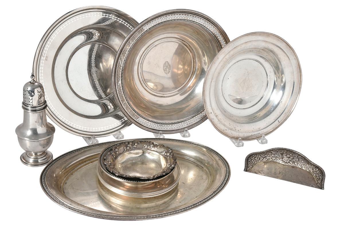 12 Pieces of Assorted Sterling Hollowware American, 20th century, including Jacobi & Jenkins crumber; oval International tray, 13.-1/2 in.; plate with openwork border, 10-1/4 in.; four bowls, 5-1/4 in. to 10-1/4 in.; four bread and butter plates; Birks caster, 7 in., most with monograms, 60.31. oz. T., all with wear and damage